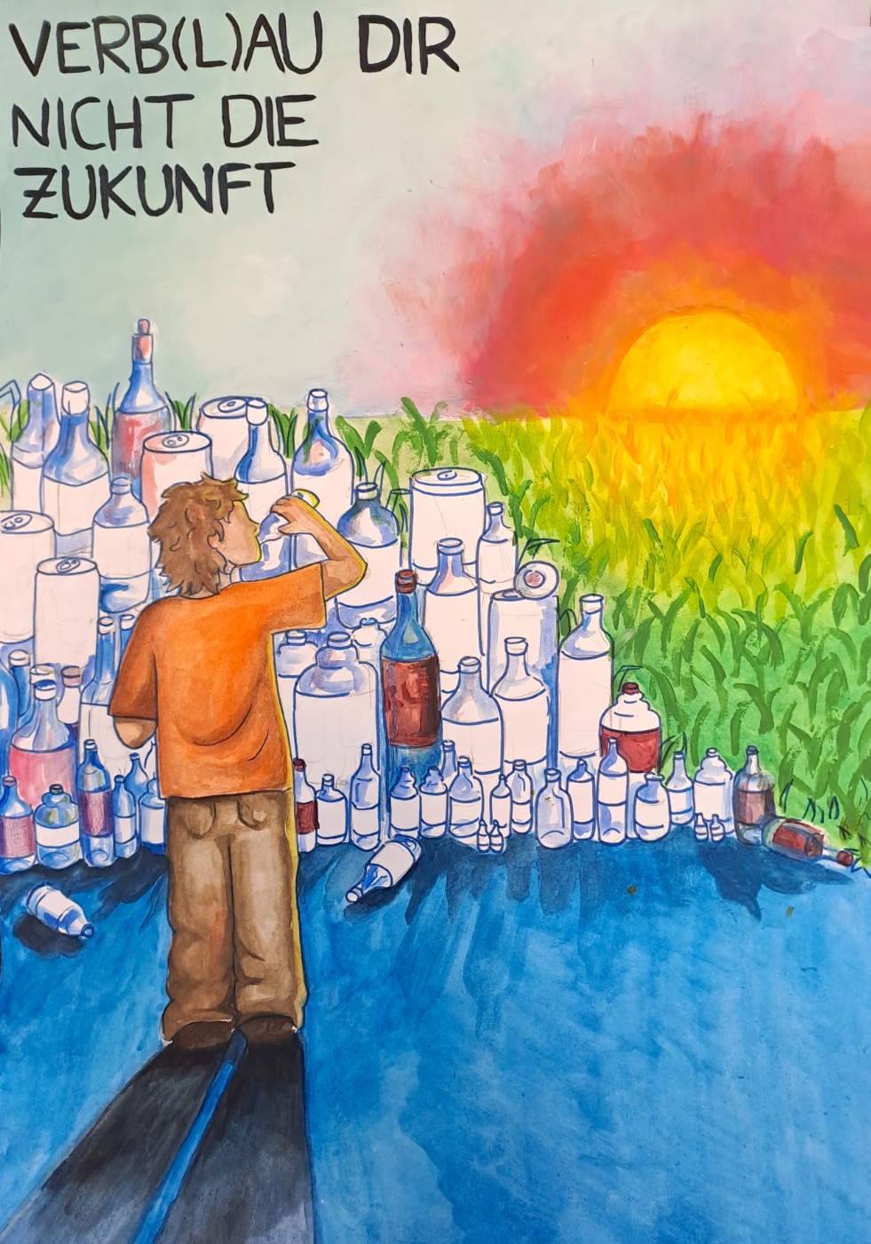 Noch immer trinken viele Jungen und Mädchen, bis die Ärztin oder der Arzt kommt. Laut Daten des Statistischen Bundesamts mussten 2022 rund 11.500 Kinder und Jugendliche im Alter von 10 bis 19 Jahren wegen akuten Alkoholmissbrauchs in deutschen Krankenhäusern behandelt werden. Die 10ten Klassen setzten sich mit dieser Thematik auseinander und es entstanden im Kunstunterricht eindrucksvolle Plakate die ein Zeichen gegen den Alkoholmissbrauch setzen. Die Plakate sind in einer Ausstellung im Mehrzweckraum für alle zu besichtigen.