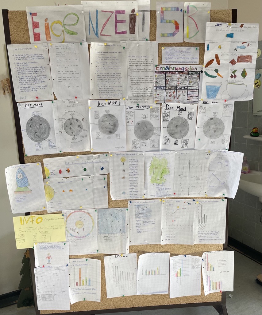 „Achtung! Achtung! Wir haben ein Problem…“ – so starteten die Schülerinnen und Schüler der Klassen 5 in das Projekt EigenZeit zum Thema „Mond“. Vom 20. bis 22. Januar 2026 beschäftigten sie sich mit dem Szenario einer gescheiterten Mondmission und arbeiteten mit viel Engagement und Freude selbstständig daran, Informationen für eine neue Mission zusammenzutragen. Aus verschiedenen Themenbereichen konnten sich die Schülerinnen und Schüler einen individuellen Stundenplan zusammenstellen und je nach Interesse einzelne Inhalte vertiefend bearbeiten. Vom Umgang mit großen Zahlen über den Einfluss des Mondes auf die Erde bis hin zu gesunder Ernährung im All war für jeden etwas dabei. Wer wollte, konnte sich zudem mit einer Bewerbung als Astronautin oder Astronaut beschäftigen oder selbst ausprobieren, welche sportlichen Übungen Astronauten vor und während einer Mission absolvieren müssen. So steht der nächsten Mondmission nichts mehr im Wege!