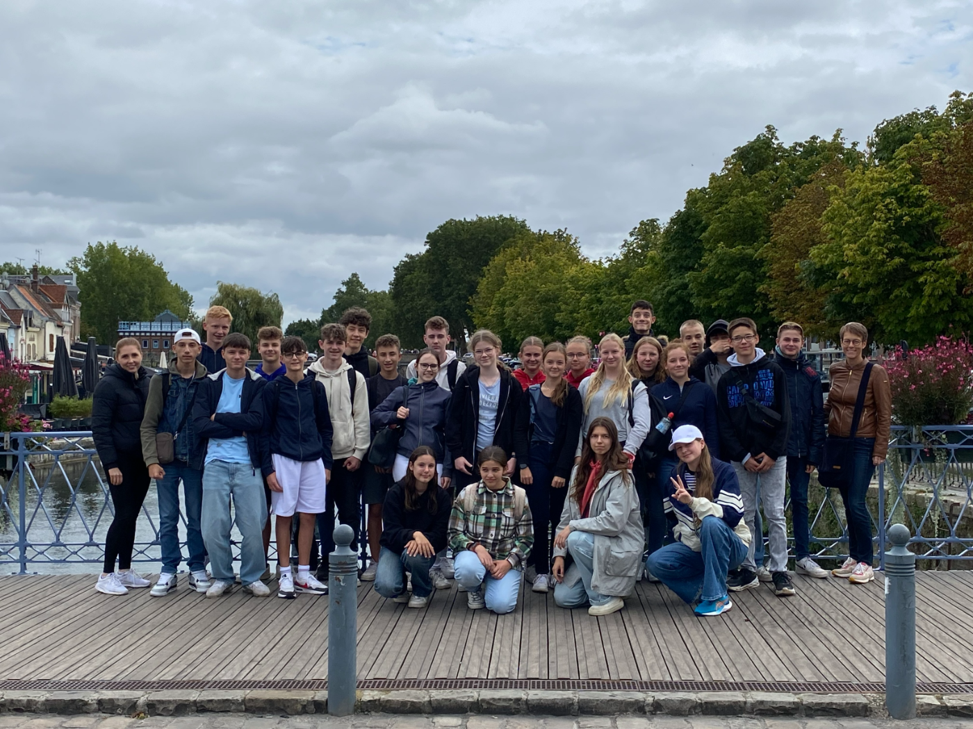 Beim diesjährigen Schüleraustausch in Buchy (Frankreich) konnte das teilweise schlechte Wetter die überaus positive Stimmung in der deutsch-französichen Gruppe in keinerlei Weise beeinträchtigen. Die Offenherzigkeit der Gastgeber und unserer Schülerinnen und Schüler half über die Sprachbarrieren hinweg und führte zu einer unvergesslichen Zeit mit einem aufregenden Programm, wozu ein gemeinsamer Orientierungslauf, ein Kunstprojekt, der Besuch des Containerhafens in Le Havre und noch vieles mehr zählte. Schließlich gab es in Paris noch ein ganz besonders aufregendes Erlebnis, als König Charles mit Camilla in einer Limousine mit Eskorte vorbeifuhr.