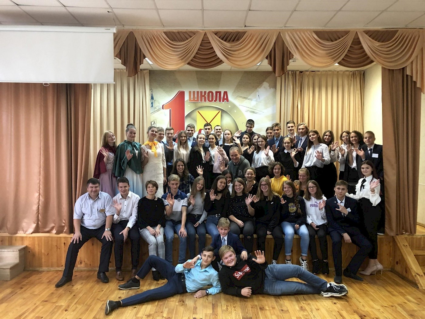 Wir erreichten Nizhny Novgorod gegen halb zwei am Mittwochmorgen und wurden von der Deutschlehrerin Svetlana Babarowa, welche uns für diese Woche ein großartiges Programm vorbereitet hatte und uns immer mit der Sprache half in Empfang genommen. Nach eineinhalb Stunden Fahrt wurden wir von unseren Gastfamilien vom Bus abgeholt. Nach einer Tasse Chai legten wir uns für vier Stunden schlafen, denn schon um 9:30 Uhr, trafen wir uns wieder in der Schule. Dort bekamen wir eine Führung durch das Gebäude des Gymnasiums. Dabei fiel auf, dass das Gebäude trotz seines Alters mit moderner Technik wie Smartboards, Beamern und einem Computer für fast jeden Schüler ausgestattet war. Außerdem besuchten wir hier das Schulmuseum über die Kriegsgeschichte und mit den Orden der Schule, der Schüler und der Lehrer. Während der Führung war das Regionalfernsehen anwesend und interviewte nach der Führung vier der SchülerInnen. Danach gingen wir in die Aula und wurden nach russischer Tradition mit Brot und Salz begrüßt. Dann gab es ein umfangreichesTanz- und Gesangsprogramm, welches uns von den unterschiedlichen Jahrgangsstufen dargeboten wurde.