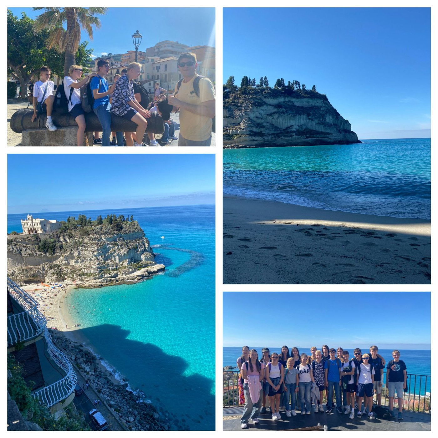 Am Montag, den 07.10.2024, sind wir nach Pizzo mit dem Reisebus gefahren und haben dort in Form eines Rollenspiels an einem Modul für das Erasmus-Projekt gearbeitet. Danach hatten wir etwas Zeit, die Stadt auf eigene Faust zu entdecken. Außerdem gab es dort das Tartufo-Eis, was dort erfunden wurde was sehr lecker war. Danach ging es weiter nach Tropea. Dort haben wir zunächst gemeinsam die Stadt erkundet und danach konnten wir noch auf eigene Faust losziehen. Dann ging es mit voller Vorfreude in das wunderschöne türkise Meerwasser, wo wir sehr viel Spaß hatten. So schnell war der Tag am Ende und wir fuhren zurück nach Catanzaro Lido. Am Dienstag, den 08.10.2024, sind wieder mit dem Reisebus gefahren, doch diesmal nach Crotone, wo wir eine sehr interessante Stadtführung hatten, bei der wir ein Museum und auch einige Kirchen sowie eine Festung besichtigt haben. Dann konnten wir wieder die Stadt erkunden und fuhren anschließend nach La Castella, wo wir mit dem Erasmus Projekt weiter machten, indem wir Masken zu den Menschenrechten gestaltet haben, weil in der Nähe auf dem Wasser ein Schiff mit Flüchtlingen verunglückte. Dies veranlasste uns zu der Frage, inwieweit in diesem Zusammenhang Menschenrechte verletzt wurden. Abschließend konnten wir im Meer unter hohem Wellengang schwimmen gehen.