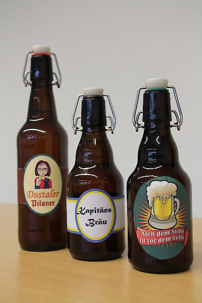 Das Ergebnis konnte sich sehen lassen: Jeweils 10 Liter Dostaler, Stiftsbräu und Kapitäns Bräu in Flaschen mit eigens entworfenen Etiketten warteten auf die Geschmacksprobe ihrer feinmundigen Braumeister.