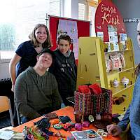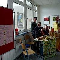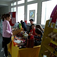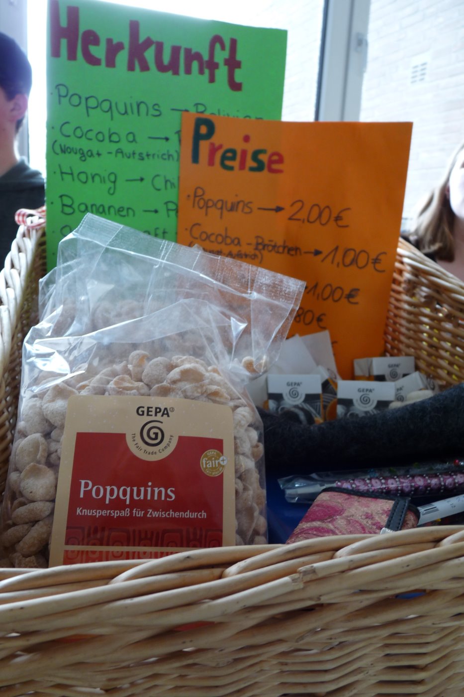 In der Pause verkaufte das Team unter anderem Brötchen mit Cocaba – eine leckere Nuss Nougat Crème mit feinen Haselnüssen, Bananen, Orangensaft und Popquins. Darüber hinaus standen auch fair gehandelte handwerkliche Produkte zum Verkauf. Das Team war mit viel Engagement bei der Sache. „Der Tag hat uns viel Spaß gemacht und kam gut an“, fasste Jana Grüters (Klasse 8e) zusammen.