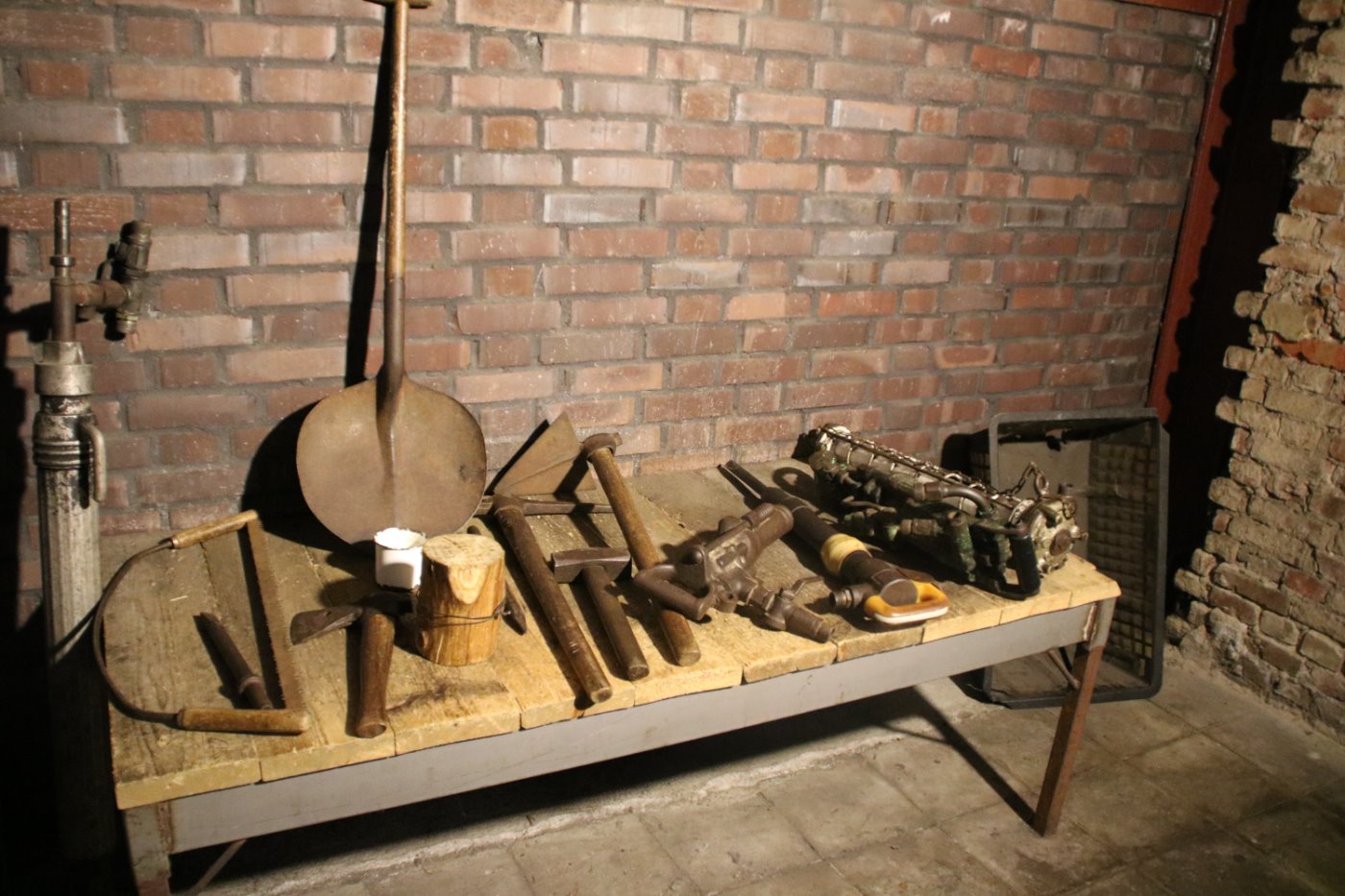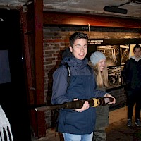 Der Gästeführer berichtete, dass den Arbeitern der Weg zu den Flözen zunächst nicht bezahlt wurde. Als der Weg zu den Flözen schließlich zur Arbeitszeit zählte, waren die Zechenbetreiber daran interessiert, dass der Weg schnell zurückgelegt werden konnte. So nutzten die Arbeiter beispielsweise das Förderband der Kohle als Transportmittel. Zum besseren Verständnis konnten die Schülerinnen und Schüler das Werkzeug auch genauer unter die Lupe nehmen. So bekamen sie beispielsweise einen Eindruck davon, wie schwer der mit Pressluft betriebene Abbauhammer ist.