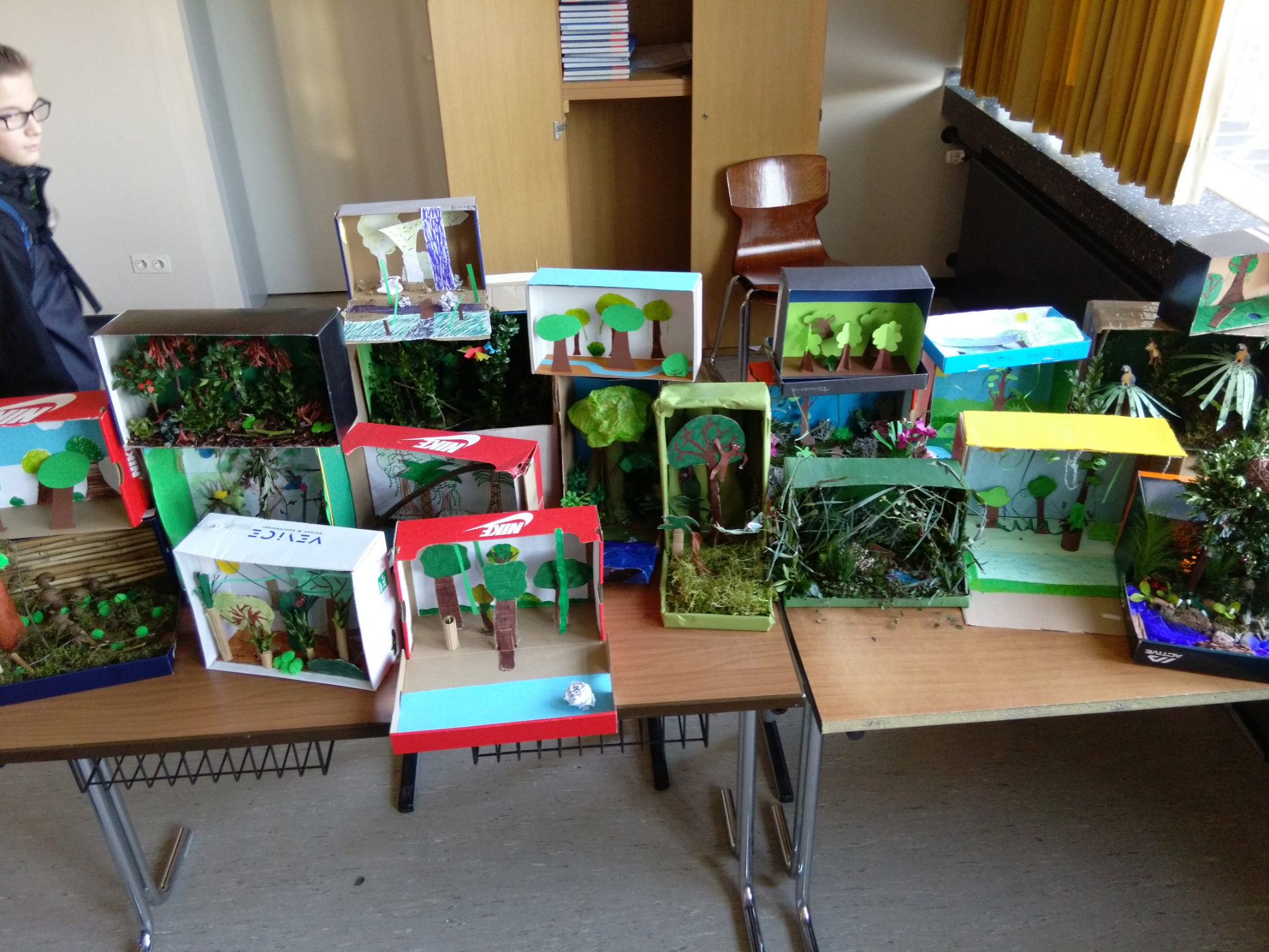 Die Klassen 7a und 7b haben im Schulfach Erdkunde von Herrn Schmitz einen Regenwald im Schuhkarton gestaltet. Auf den Bildern sieht man die grandiosen Ergebnisse. Wichtig war dabei, dass die Bäume möglichst im richtigen Maßstab zu einer Skala standen. Hierbei sollte man den Stockwerkbau erkennen und erläutern können. Neben der Zeit im Unterricht investierten die Schüler/innen viel Mühe und Freizeit, um zu diesen tollen Ergebnissen zu kommen. Details wie Regenwildtiere wurde teilweise aus natürlichen Materialien gestaltet.
