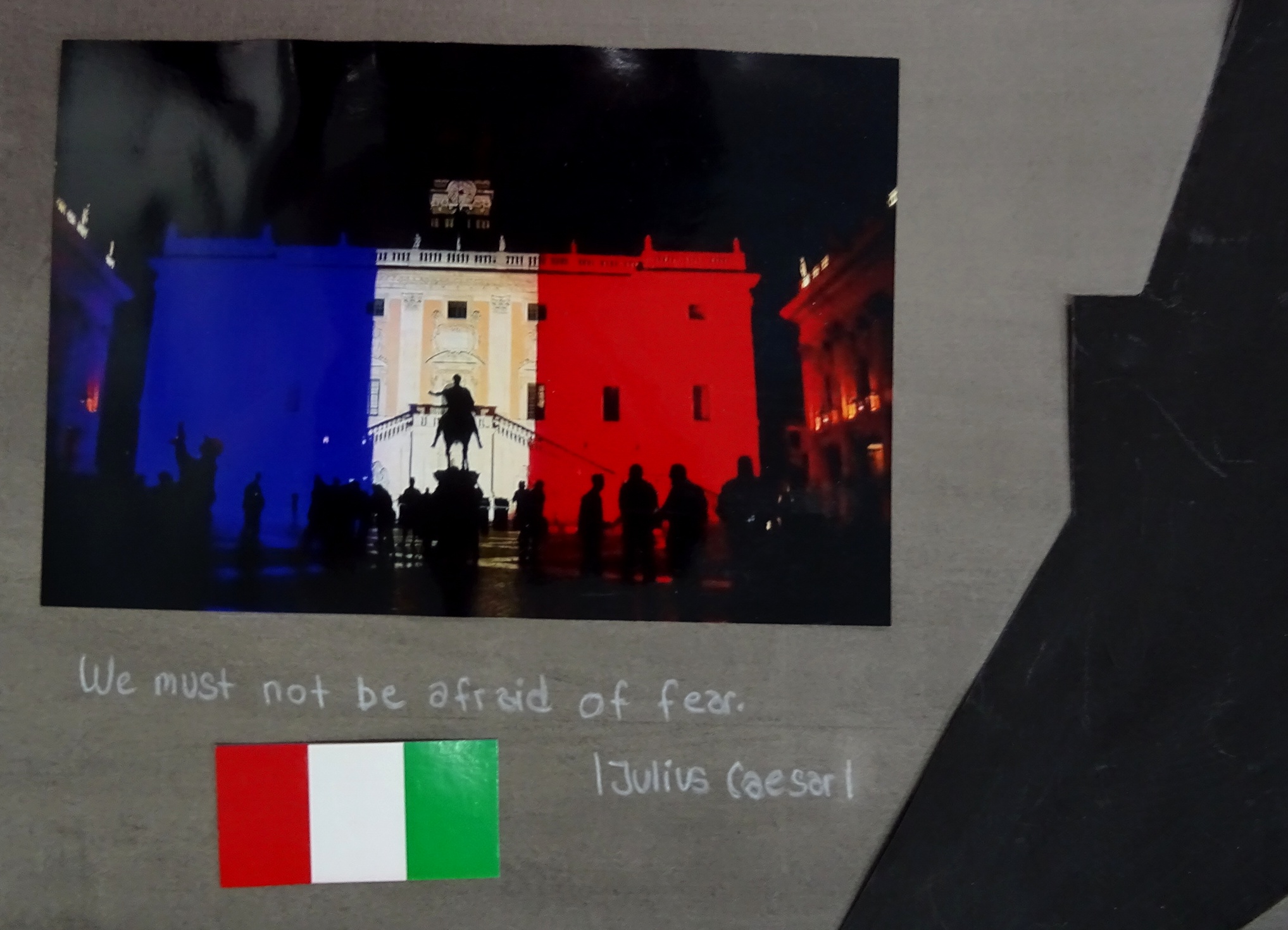 Antonias und Monas Collage, die im Kunstunterricht der Europaklasse entstand, thematisiert eine dieser neuen Herausforderungen, die sich Europa in Zeiten von Terrorgefahr und Terrorakten stellen muss. Die Collage zeigt die Anteilnahme und Solidarität vieler europäischer Länder nach dem Terrorakt 2015 in Paris, sowie Zitate von berühmten Persönlichkeiten über Werte, die ein Europa der Zukunft ausmacht.