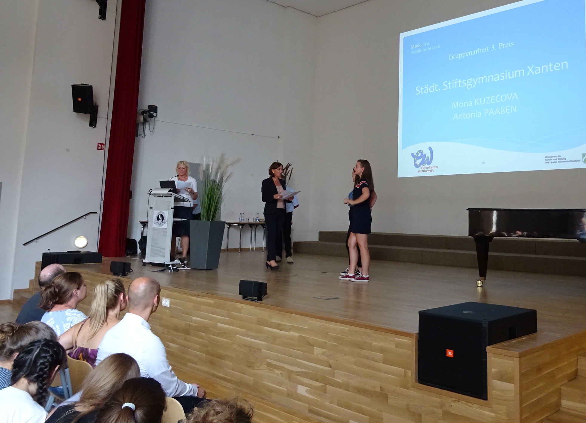Antonia Paaßen und Mona Kuznecova, zwei Schülerinnen aus der diesjährigen Europaklasse (EP), konnten beim ältesten Schülerwettbewerb Deutschlands einen dritten Platz erzielen. Damit setzten sie sich mit ihrer Collage gegenüber 2.000 andere Teilnehmer in NRW durch und durften ihren Preis in Düsseldorf von Schulministerin Yvonne Gebauer persönlich entgegennehmen.