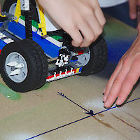 Für den Wettbewerb musste ein Fahrzeug konstruiert werden, welches nach Start von einer Rampe einen mit Wasser gefüllten Becher möglichst unbeschadet „durch“ einen CRASH an einer Wand transportieren sollte.