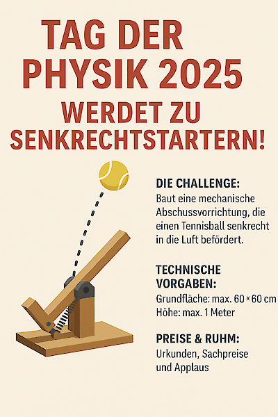 Am 08. Juli 2025 ist es wieder so weit: Der „Tag der Physik“ geht in die 17. Runde – und diesmal wird’s besonders spannend! Unter dem Motto „Der Senkrechtstarter“ seid ihr gefragt: Wer schafft es, mit Köpfchen, Kreativität und physikalischem Know-how den perfekten Höhenflug zu erreichen?