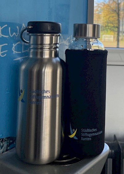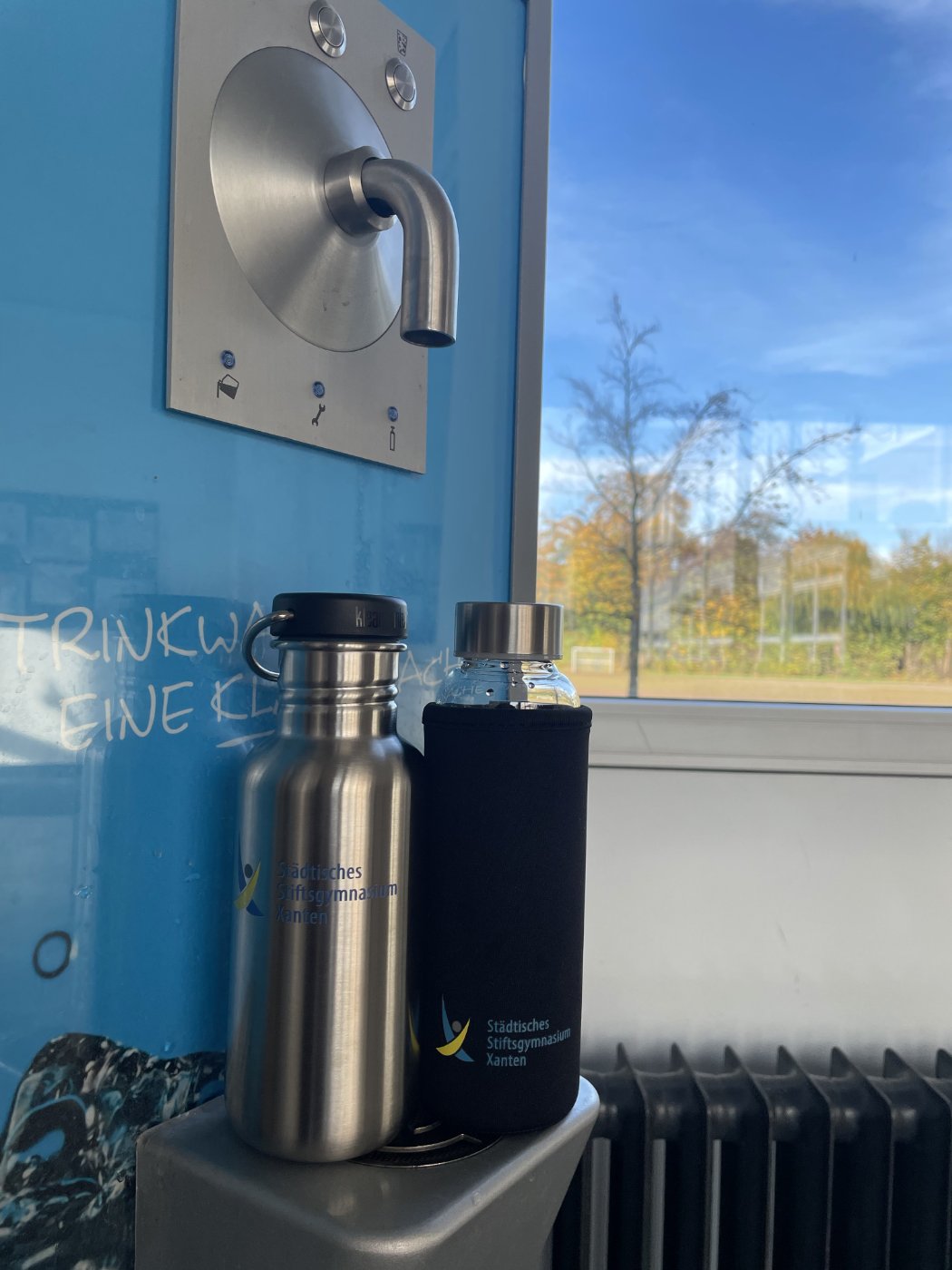Die SV hat schon vor einiger Zeit den Wünsch ihrer Mitschüler:innen aufgenommen, Trinkflaschen mit unserem Schullogo ins Angebot aufzunehmen. Nach einem gemeinsamen Entscheidungsprozess unter Beteiligung von Schüler:innen, Eltern und Lehrer:innen und ein wenig Wartezeit bis zur Fertigstellung ist es nun endlich soweit. Die etwas kleinere Glasflasche der Firma spottle kann für 10 €, die Edestahl-Variante der Firma kleenkanteen für 15€ erworben werden. Die Preise sind so unschlagbar, weil die SV sich dazu entschieden hat, einen Zuschuss für die Anschaffung der Flaschen beizutragen. Jetzt steht dem Zugang zu frischem, sprudeligem Wasser aus unserem Wasserspender nichts mehr im Wege. Die drei Kanditaten geben ein gutes Team ab, nicht wahr?