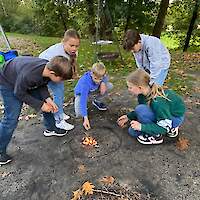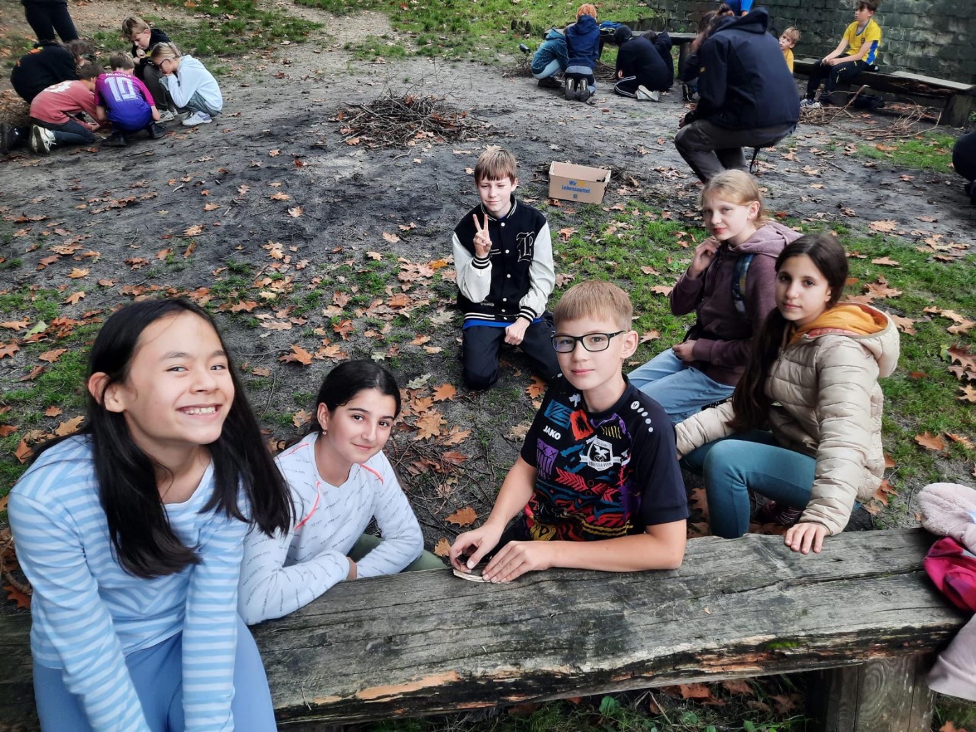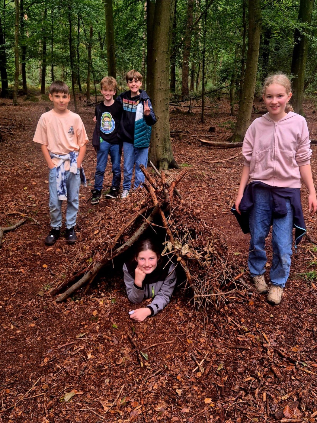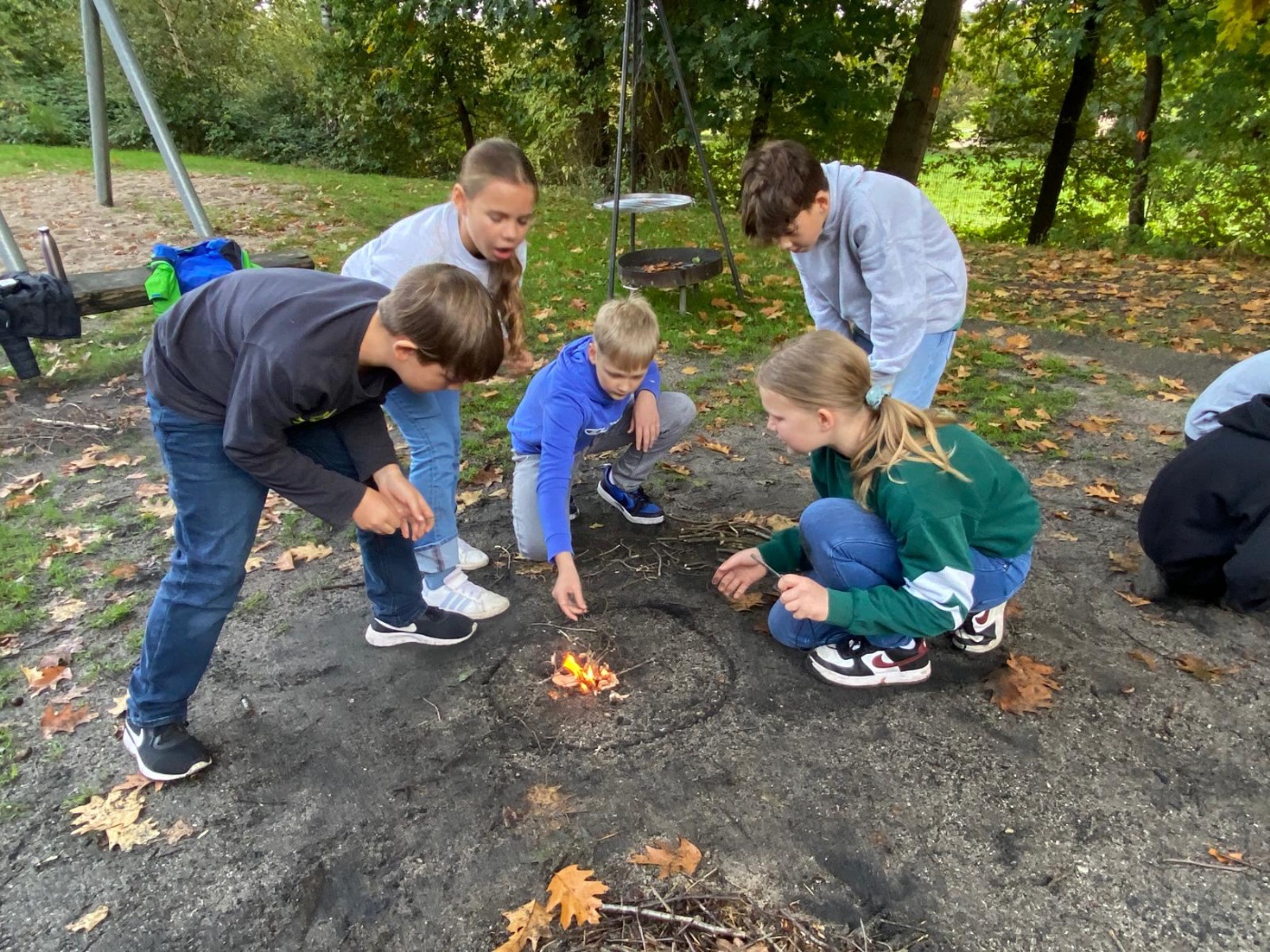 Für 107 Schü­le­rin­nen und Schü­ler star­te­te eine span­nen­de Woche zunächst mit einer drei­tä­ti­gen Klas­sen­fahrt zum Wolfs­berg nach Kle­ve. Bei bes­tem Wet­ter soll­ten unter Anlei­tung von Natur­gui­de Wal­de­mar und sei­nem Team im Wald Schutz­hüt­ten ent­ste­hen, in Grup­pen wur­de gemein­sam geplant, gesam­melt und erfolg­reich gebaut. Auch beim Feu­er­ma­chen mit Feu­er­stein und Rei­sig wur­de Zusam­men­ar­beit und Geduld am Ende bei allen belohnt, der Jubel war groß, als die ers­ten Flam­men zu sehen waren.
