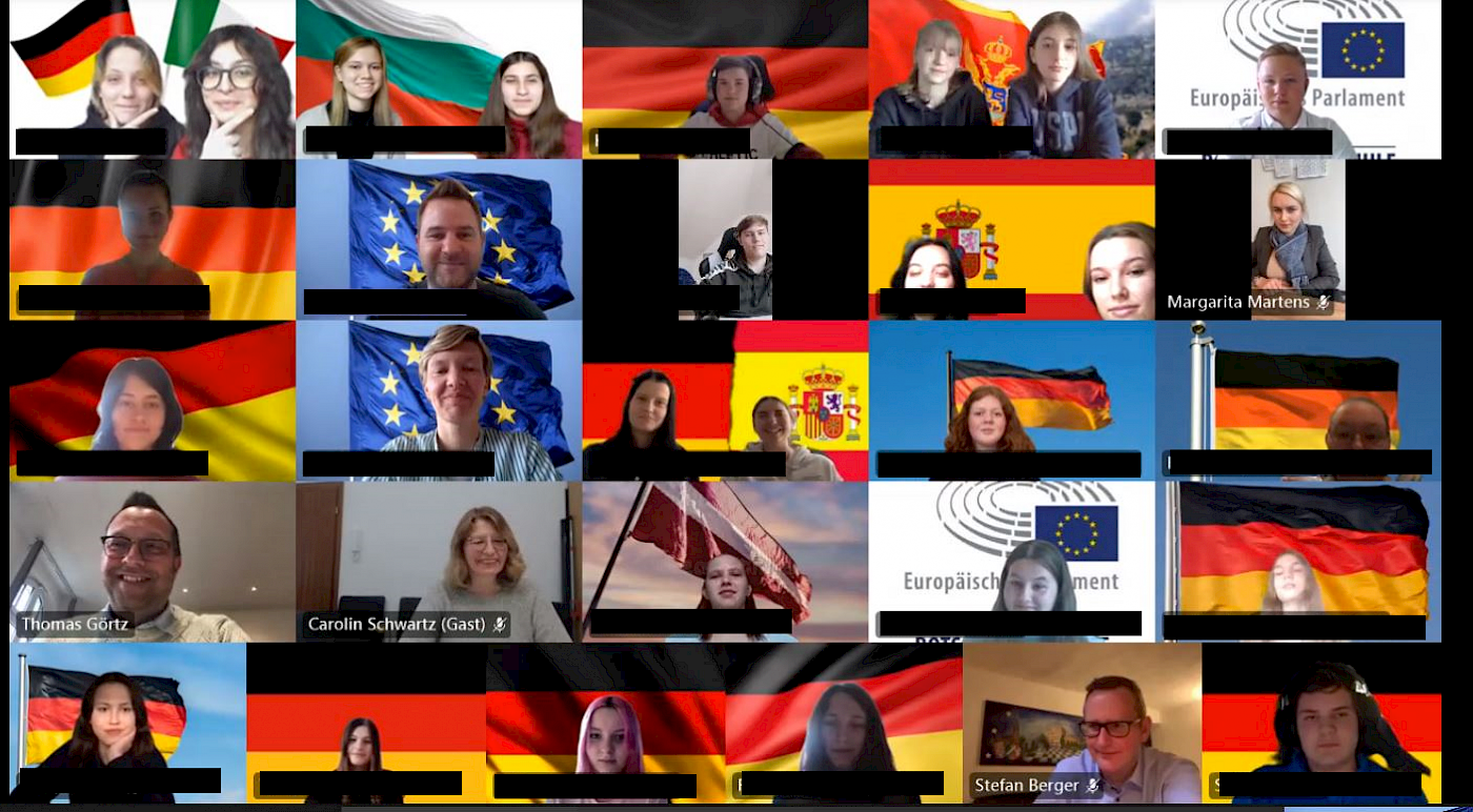 In einem einstündigen Interview stellte sich Dr. Berger den Fragen der Schülerinnen und Schüler. Diese waren gut vorbereitet und wollten beispielsweise wissen, wie die Zukunft Europas aussieht, welche konkrete Auswirkungen die Corona-Pandemie auf wirtschaftliche Entwicklungen in Europa hat und sprachen ebenso Punkte an, wie beispielsweise die Frontex-Initiative zur Sicherung der EU- Außengrenzen, die von den Schülern sehr kritisch hinterfragt wurden. Dr. Berger betonte mehrfach, dass es insbesondere aufgrund vieler aktueller Herausforderungen besonders wichtig sei, das Konstrukt der Europäischen Union weiterhin zu stärken. Ein Land alleine könne beispielsweise nicht dem Klimawandel entgegenwirken, hier müssten möglichst viele Länder, besser noch die ganze Welt an einem Strang ziehen. Zudem betonte er, dass das Europäische Parlament in Brüssel derzeit die einzige Möglichkeit sei, so viele Staaten zusammenzubringen, auch wenn dies mit Kompromissen und teils langen Entscheidungsprozessen einhergehe.