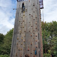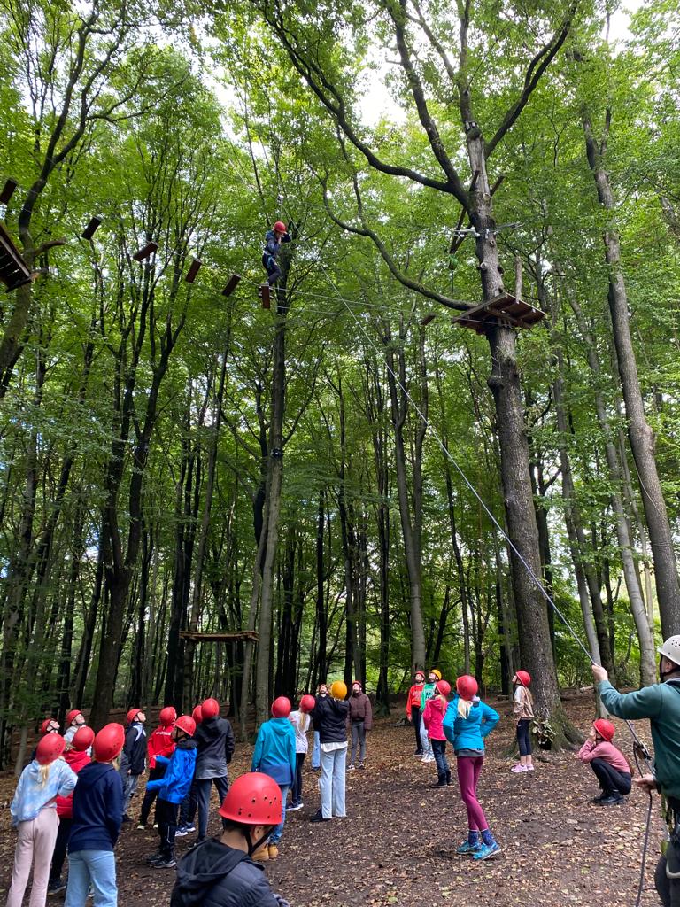 Gemeinsam mit ihren Klassenlehrerinnen starteten am Montag 107 Sechstklässler:innen ins bergische Land nach Radevormwald. Nachdem Koffer und Taschen in der Jugendbildungsstätte des Ortes verstaut waren, ging es für die jungen Schülerinnen und Schüler auf Erkundungstour. Dabei hieß es zunächst – trotz Regenwetters – am kniffligen Kletterturm einen guten Halt zu beweisen. Hierbei lernten die Schülerinnen und Schüler, sich gegenseitig zu sichern und die eigene Höhenangst zu überwinden.