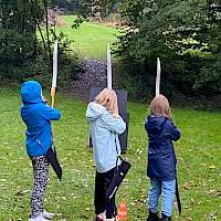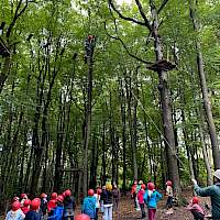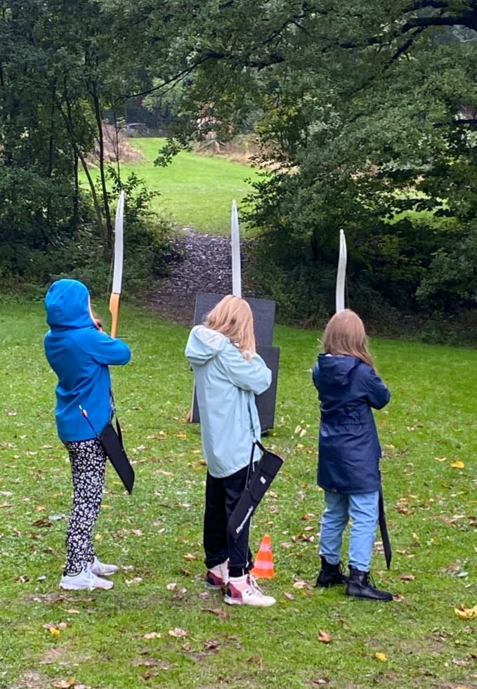 Gleiches galt für den Hochseilgarten im angrenzenden Wald, bei dem mit rasantem Tempo die Seilbahn heruntergerutscht werden konnte. Beim Bogenschießen bewiesen die Schülerinnen und Schüler unter fachmännischer Anleitung Zielsicherheit und landeten Treffer bei bunten Ballons und Gummitieren. Zielsicherheit bewiesen sie und die Lehrkräfte auch bei einem abendlichen Handball-Turnier, das von allen Seiten lautstark angefeuert wurde.