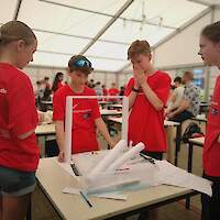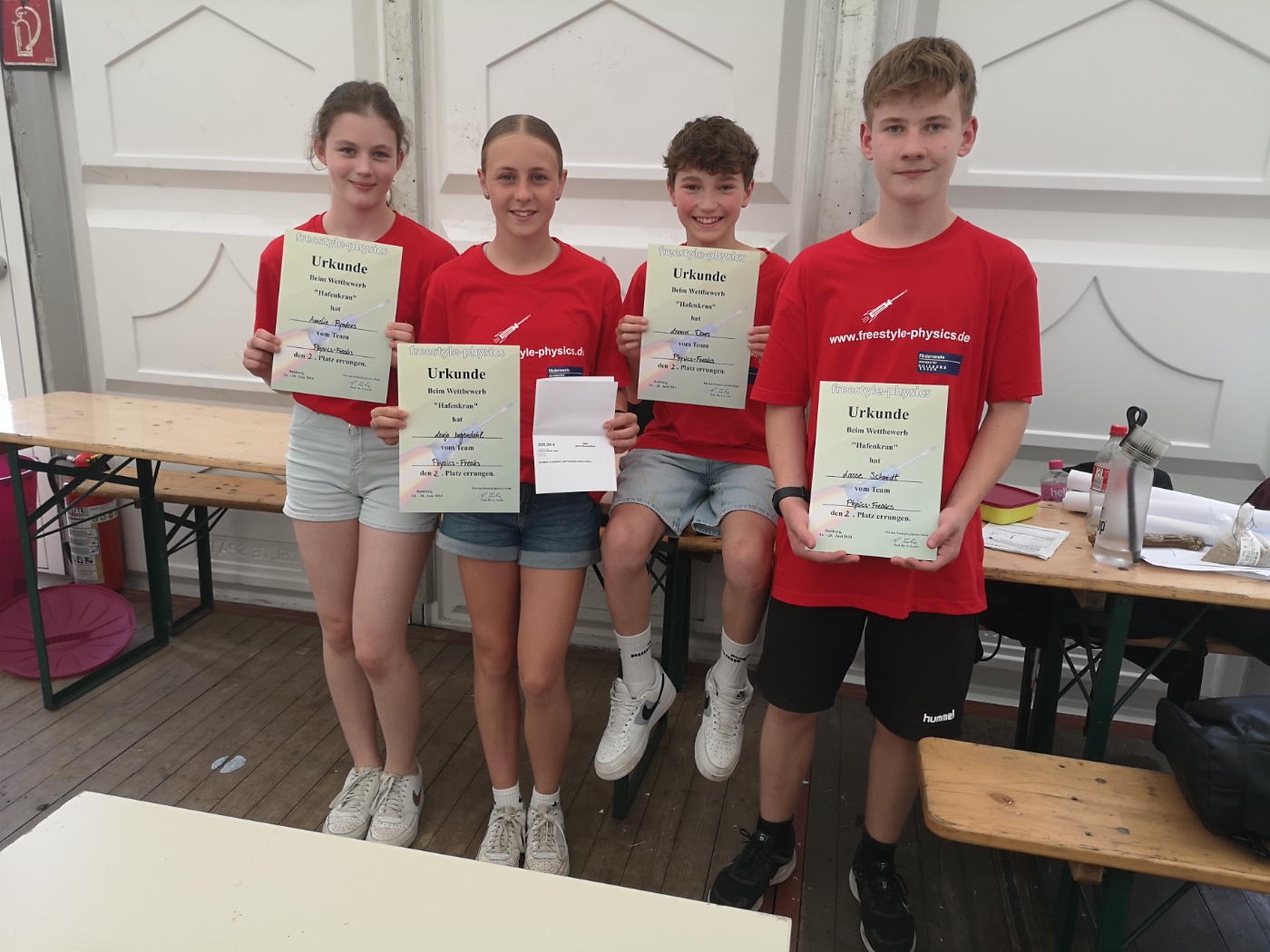 Die Schülerinnen und Schüler aus der 8c, Lenja, Amelie, Lennox und Lasse haben es geschafft, einen Kran mit einem Eigengewicht von 17,9 g nur aus Papier und Bastelkleber zu bauen und belegten damit den zweiten Platz. Sie konnten sich gegen ca. 200 Teilnehmergruppen aus ganz NRW durchsetzen und erhielten einen Gutschein in Höhe von 200 Euro. Herzlichen Glückwunsch.