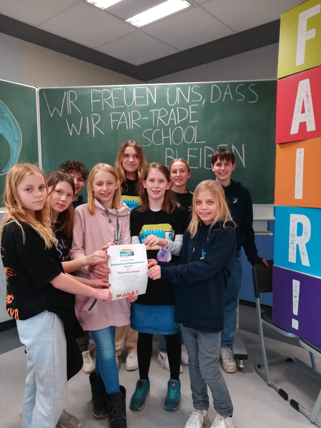 Unsere Schule ist zwei weitere Jahre Fairtrade-School und verkauft weiterhin leckere Fairtrade-Produkte. Wir wollen in den nächsten zwei Jahren außerdem in Kindergärten, Grundschulen und Altenzentren in Xanten Fairtrade-Produkte vorstellen und über Fairtrade informieren. Wir wollen andere Menschen in Xanten, die – wie wir – Fairtrade-Produkte verkaufen, interviewen. Auch Klimagerechtigkeit ist uns wichtig. Deshalb werden wir uns dafür einsetzen! Über neue Gesichter in unserem Team freuen wir uns immer. Treffpunkt: Dienstags nach der 4. Stunde in D002.