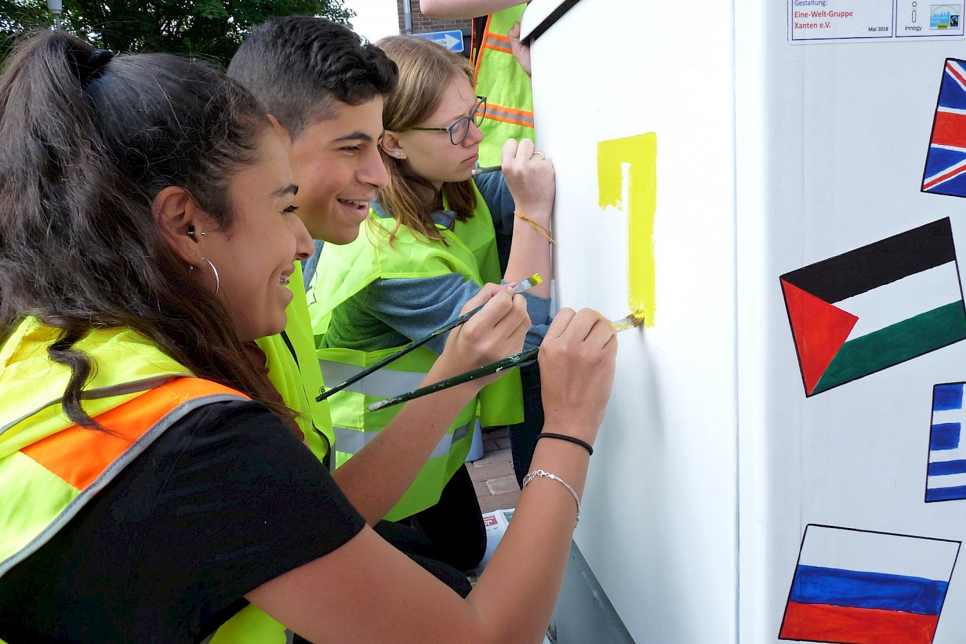 Donnerstag ging es gemeinsam nach Dortmund. Das Street-Art Bingo, eine Art Stadtparcours, bei dem möglichst viele bestimmte Graffitis in einem bestimmten Gebiet innerhalb von 90 Minuten gefunden werden mussten, brachte die Gruppe näher zusammen. Beim Biparcour durch die Stadt Xanten mussten dann am folgenden Tag verschiedene Gruppen Aufgaben lösen und möglichst viele virtuelle Punkte sammeln, während die Stadtgeschichte aufgearbeitet wurde. Innerhalb der Rallye bemalten die Schüler einen der Stromkästen aus dem Projekt „Xanten FAIRschönern“ neu an. Zielpunkt der Stadtrallye war das Rathaus, bei dem Thomas Görtz auch von seinem Besuch in Palästina berichtete. Der Abend endete für manch einen feierlich auf dem Abschlussball der Abiturienten des SSGX. Andere wiederum statteten der Mittsommernacht einen Besuch ab, nach einer durch die Schüler selbst organisierten Tretbootfahrt.