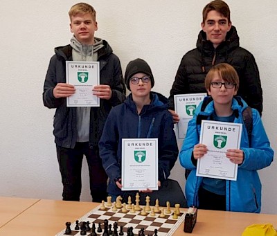 Neben den aktiven Spielern Friedrich Postler, Cedric Tekath, Joost Kallenberg und Jan Manten, bedanken wir uns auch sehr herzlich bei Hendrik Oenings, der in den letzten Jahren eine leitende Funktion in der Schach AG übernommen hat. Nun freuen wir uns auf das Landesfinale in Düsseldorf, welches am 8. März 2019 stattfinden wird.