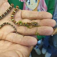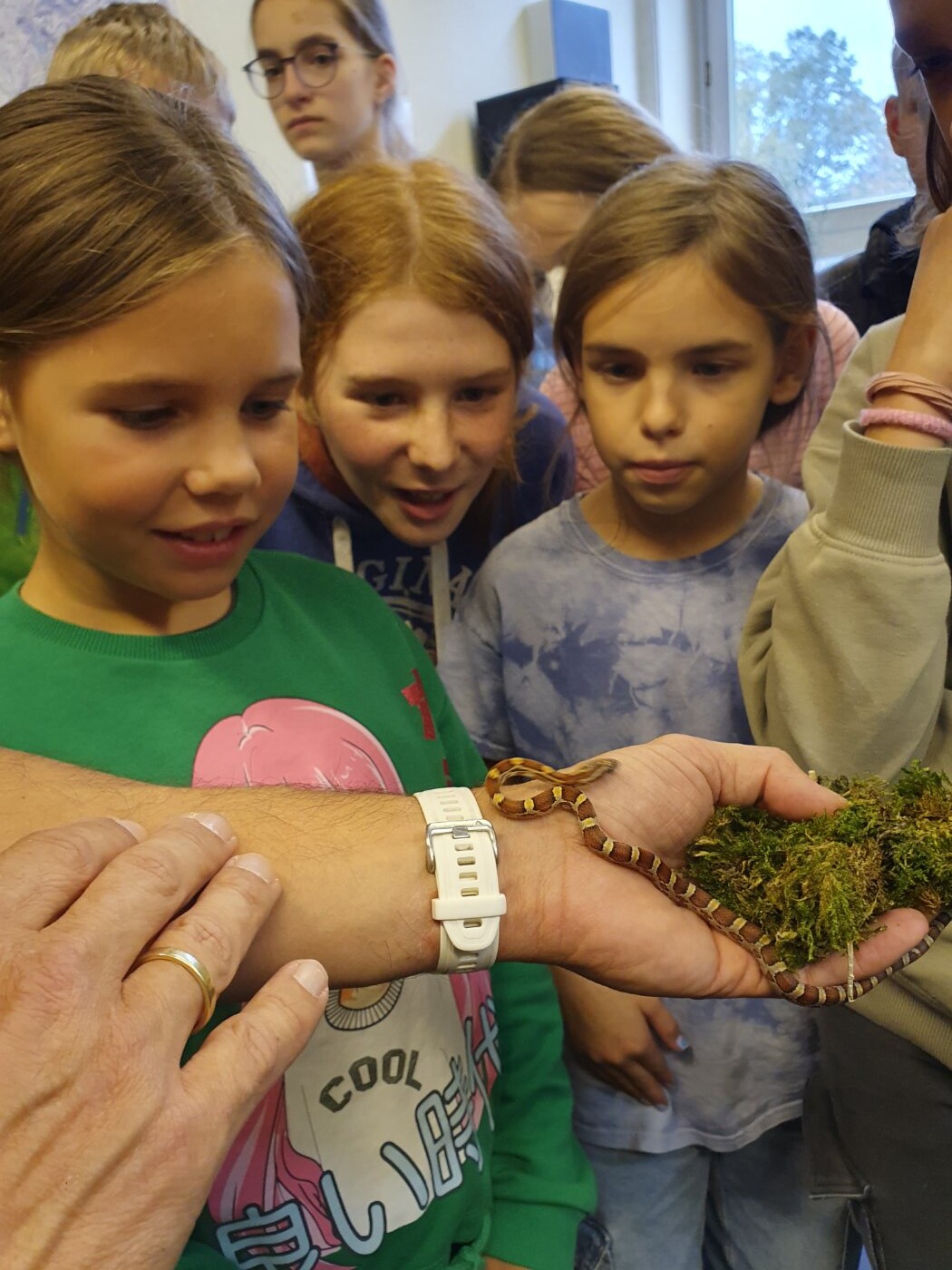 Seit Oktober 2023 pflege wir nsogar Reptilien. Flix und Flux, zwei junge Kornnattern, die wir über den Ring der Vivariumschulen vom Wilhelm Dörpfeld Gymnasium in Wuppertal gegen Eier unserer Türkisblauen Stabschrecken (Achrioptera manga) erhalten haben, bereichern das Leben im Vivarium und werden schon ab und zu im Unterricht eingesetzt.