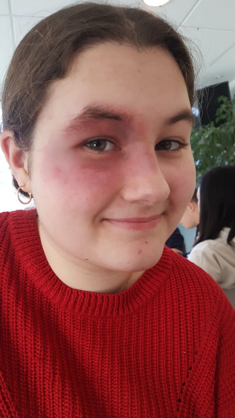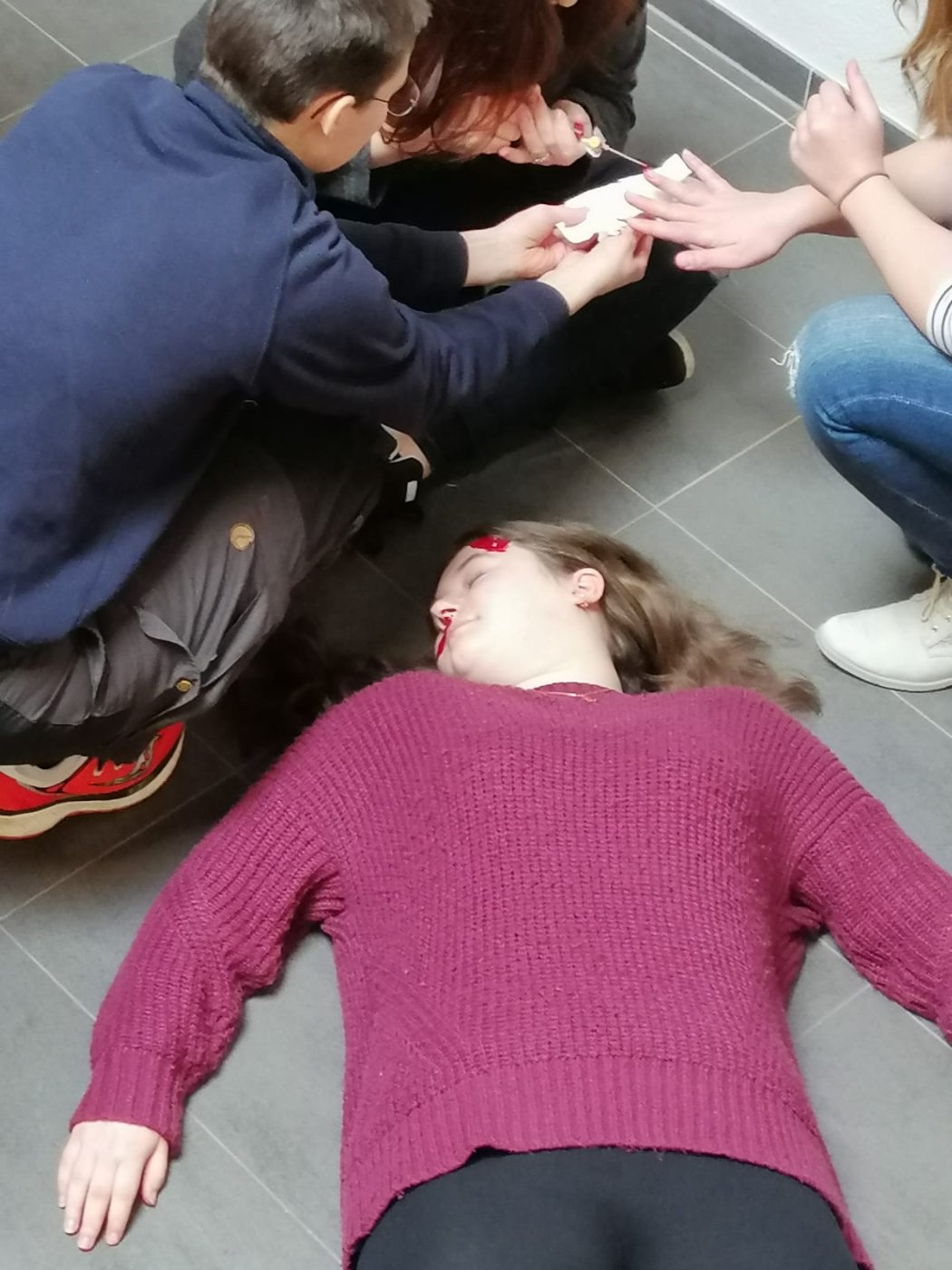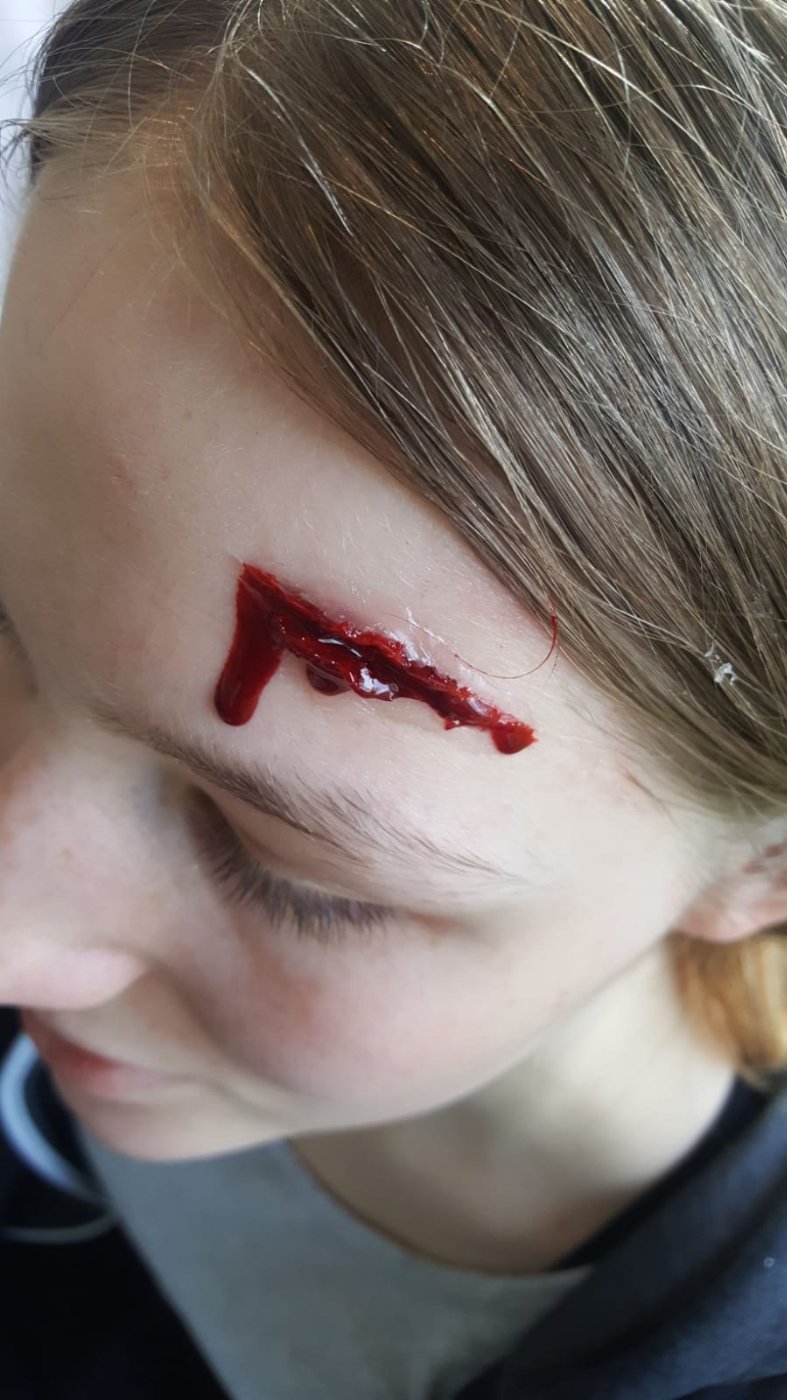 Das Schminken einer Platzwunde (siehe Foto) und die Darstellung vieler anderer Verletzungen lernten unsere Schulsanis bei dem Notfalldarstellungslehrgang im Januar.