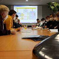 Im Anschluss an die Führung hatten die Schülerinnen und Schüler ihren Auftritt: In kurzen Präsentationen stellten sie einzelne Module einer Alarmanlage vor. Diese Module wurden in einem Elektrotechnik-Workshop unter Leitung von Herrn Dr. Brockerhoff hergestellt, den die Schülerinnen und Schüler zusätzlich zum normalen Unterricht über mehrere Wochen besuchten. Das Ergebnis konnte sich sehen lassen: Der finale Test der Alarmanlage, die durch die Kombination der Module zusammengebaut wurde, war erfolgreich.