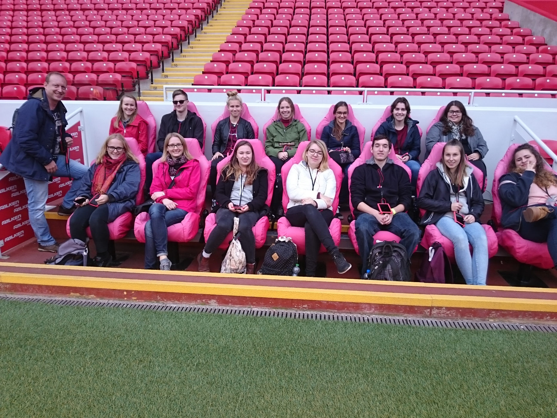 Schließlich rundete eine Tour durch das Anfield Road Stadion, welches als Heimat des traditionsreichen Liverpooler Fußballvereins gilt, unsere Kursfahrt ab. Hier erhielten wir spannende Einblicke hinter die Kulissen, durften unsere eigene „Pressekonferenz“ geben, die Kabinen der Mannschaften erkunden und auf der Tribüne Platz nehmen.
