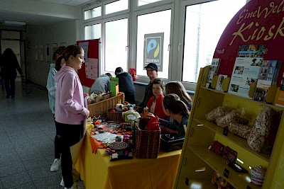 In der Pause verkaufte das Team unter anderem Brötchen mit Cocaba – eine leckere Nuss Nougat Crème mit feinen Haselnüssen, Bananen, Orangensaft und Popquins. Darüber hinaus standen auch fair gehandelte handwerkliche Produkte zum Verkauf. Das Team war mit viel Engagement bei der Sache. „Der Tag hat uns viel Spaß gemacht und kam gut an“, fasste Jana Grüters (Klasse 8e) zusammen.