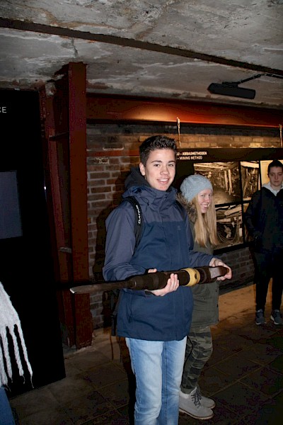 Der Gästeführer berichtete, dass den Arbeitern der Weg zu den Flözen zunächst nicht bezahlt wurde. Als der Weg zu den Flözen schließlich zur Arbeitszeit zählte, waren die Zechenbetreiber daran interessiert, dass der Weg schnell zurückgelegt werden konnte. So nutzten die Arbeiter beispielsweise das Förderband der Kohle als Transportmittel. Zum besseren Verständnis konnten die Schülerinnen und Schüler das Werkzeug auch genauer unter die Lupe nehmen. So bekamen sie beispielsweise einen Eindruck davon, wie schwer der mit Pressluft betriebene Abbauhammer ist.