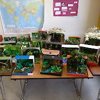 Die Klassen 7a und 7b haben im Schulfach Erdkunde von Herrn Schmitz einen Regenwald im Schuhkarton gestaltet. Auf den Bildern sieht man die grandiosen Ergebnisse. Wichtig war dabei, dass die Bäume möglichst im richtigen Maßstab zu einer Skala standen. Hierbei sollte man den Stockwerkbau erkennen und erläutern können. Neben der Zeit im Unterricht investierten die Schüler/innen viel Mühe und Freizeit, um zu diesen tollen Ergebnissen zu kommen. Details wie Regenwildtiere wurde teilweise aus natürlichen Materialien gestaltet.