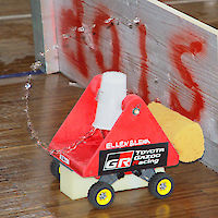 Für den Wettbewerb musste ein Fahrzeug konstruiert werden, welches nach Start von einer Rampe einen mit Wasser gefüllten Becher möglichst unbeschadet „durch“ einen CRASH an einer Wand transportieren sollte.