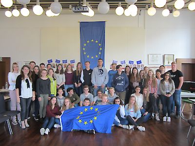 Im Rathaussaal hatten sie die Gelegenheit, an einem Planspiel der Landeszentrale für Politische Bildung teilzunehmen. Dabei wurden sie in die Lage echter EU-Politiker versetzt und mussten sich auf einen Gesetzesentwurf einigen.