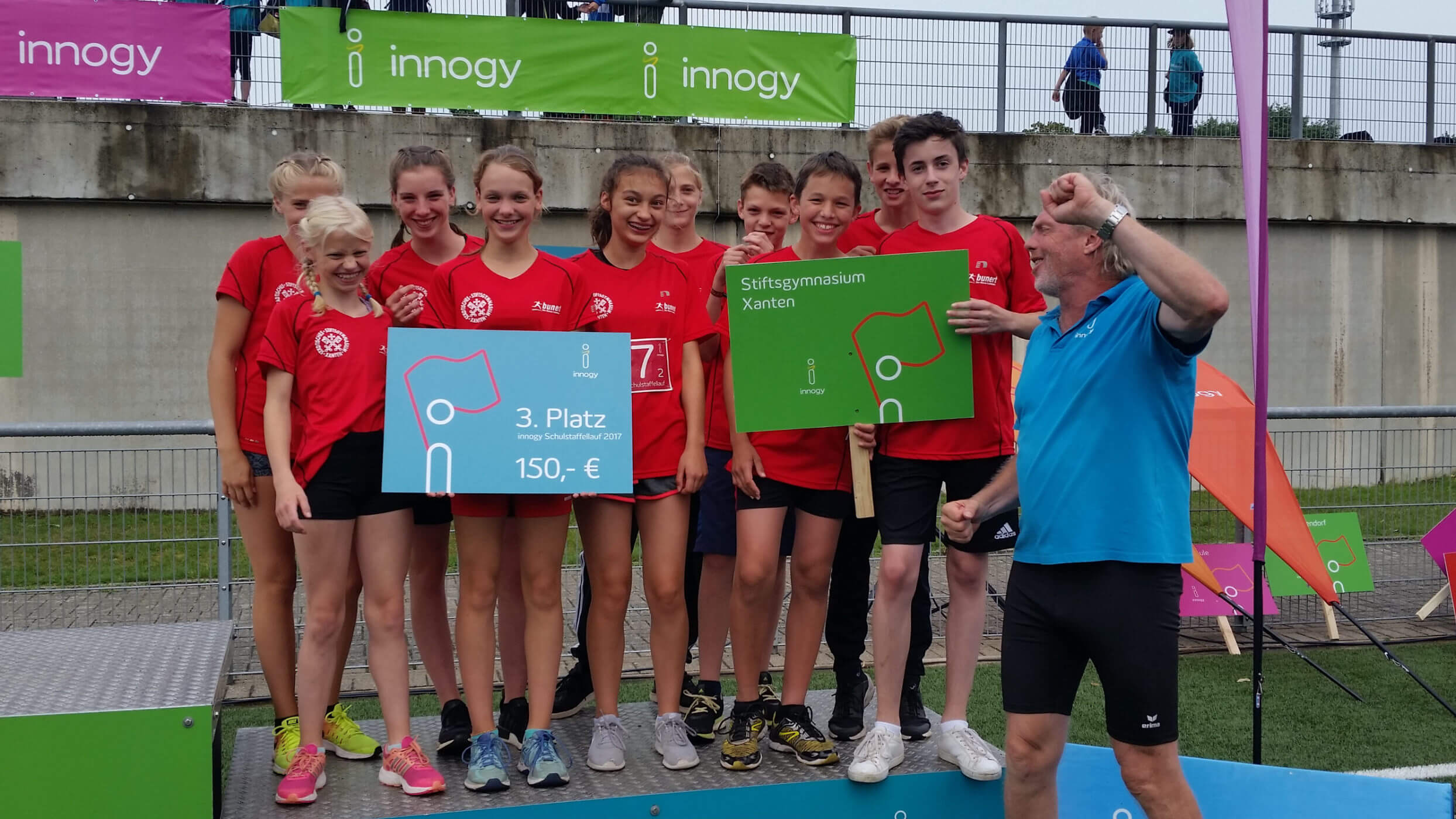 Die Schulstaffel bestehend aus Merret Manten, Zoe Rehbock, Jessica Terhorst, Alexander Thiel, Tim Herr, Johanna Keller, Anna-Lena Berninger sowie Schlussläufer Jos Landers trat am Mittwoch zum Finale des innogy-Schulstaffellaufs in Rheine an. Insgesamt waren 23 Mannschaften aus dem ganzen Bundesland eingeladen. Aufgrund der Leistung aus dem Vorlauf startete die Xantener Staffel im schnellsten Lauf, in dem sie sich starker Konkurrenz ausgesetzt sah. Nicht alle Wechsel klappten einwandfrei, dafür boten alle Läufer eine starke kämpferische Leistung. Am Ende fehlte nach einem spannenden Finish nur ein knapper Meter auf Rang 2!