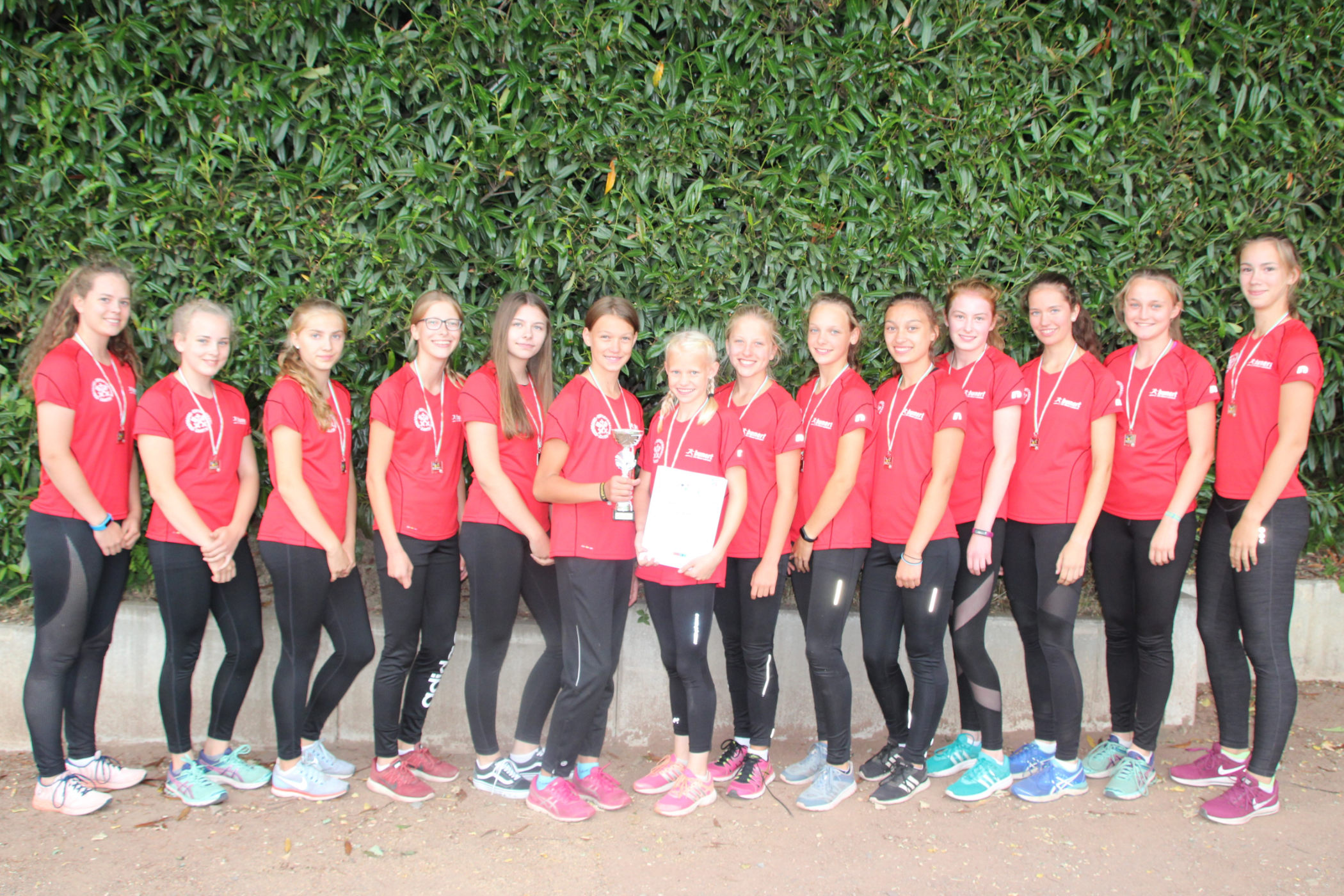 Beim Landesfinale in Leverkusen traten in verschiedenen Wettkampfklassen jeweils die sechs besten Leichtathletikteams aus NRW gegeneinander an. Trotz nicht ganz optimaler äußerer Bedingungen liefen die Athletinnen unserer Leichtathletikmannschaft zur Höchstform auf und zeigten fantastische Einzelleistungen. Konnte man sich in einigen Disziplinen (z.B. im Weitsprung oder Sprint) zum Teil deutlich vor der Konkurrenz platzieren, wurde spätestens im 800m-Lauf klar, in dem zwei Athletinnen aus Dormagen die Konkurrentinnen regelrecht überrannten, dass es für Platz 1 und der damit verbundenen Titelverteidigung leider nicht reichen würde. Trotzdem zeigten sich die Coachs Yves Reinders und Andreas Gorczok mit Platz 2 sowie der großartigen und geschlossenen Mannschaftsleistung höchst zufrieden. Mit 6984 Punkten verbesserte man sich sogar noch einmal um 61 Punkte im Vergleich zu den Kreismeisterschaften.