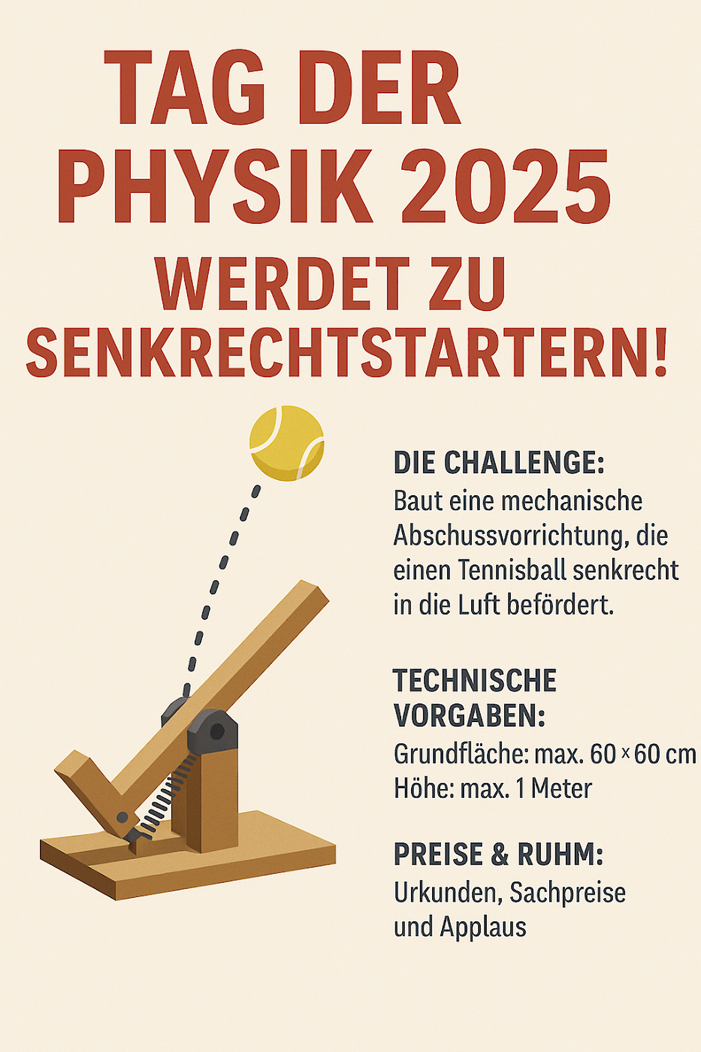 Am 08. Juli 2025 ist es wieder so weit: Der „Tag der Physik“ geht in die 17. Runde – und diesmal wird’s besonders spannend! Unter dem Motto „Der Senkrechtstarter“ seid ihr gefragt: Wer schafft es, mit Köpfchen, Kreativität und physikalischem Know-how den perfekten Höhenflug zu erreichen?