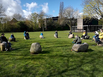 Schüler*innen der Jahrgangsstufe 6 beschäftigten sich zunächst im Religionsunterricht mit der jüdischen Religion und 1700 Jahren jüdischem Leben in Deutschland. Die Themenführung „Die jüdische Geschichte in Xanten“ am 7. April 2022 in Zusammenarbeit mit der Stadt begann an der Touristinformation, und führte die Schüler*innen über verschiedene Orte des Erinnerns durch die Innenstadt. An unterschiedlichen Orten wurden die Spuren jüdischen Lebens in Xanten entdeckt: Stolpersteine, Bischofsburg und Krypta des Doms brächten den Schüler*innen Zeiten der Judenpogrome in Xanten näher. Nach kräftigem Regen erstrahlte die Sonne am blauen Himmel und ließ alle Hoffnung und Zuversicht spüren. „Ich möchte mich eigentlich nicht mit diesem schrecklichen Thema im Unterricht beschäftigen, aber es ist wichtig es zu tun, damit so etwas nicht nochmal passiert“, kommentierte ein Schüler die Unterrichtssequenz zu der NS – Zeit.