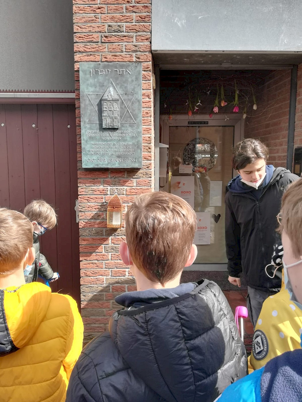 Schüler*innen der Jahrgangsstufe 6 beschäftigten sich zunächst im Religionsunterricht mit der jüdischen Religion und 1700 Jahren jüdischem Leben in Deutschland. Die Themenführung „Die jüdische Geschichte in Xanten“ am 7. April 2022 in Zusammenarbeit mit der Stadt begann an der Touristinformation, und führte die Schüler*innen über verschiedene Orte des Erinnerns durch die Innenstadt. An unterschiedlichen Orten wurden die Spuren jüdischen Lebens in Xanten entdeckt: Stolpersteine, Bischofsburg und Krypta des Doms brächten den Schüler*innen Zeiten der Judenpogrome in Xanten näher. Nach kräftigem Regen erstrahlte die Sonne am blauen Himmel und ließ alle Hoffnung und Zuversicht spüren. „Ich möchte mich eigentlich nicht mit diesem schrecklichen Thema im Unterricht beschäftigen, aber es ist wichtig es zu tun, damit so etwas nicht nochmal passiert“, kommentierte ein Schüler die Unterrichtssequenz zu der NS – Zeit.