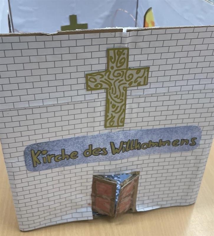 Die Schülerinnen und Schüler des Kurses Katholische Religion Klasse 6 und ihre Lehrerin Frau Peters freuen sich, dass sie im Dom ihre Projektergebnisse aus dem Unterricht präsentieren dürfen. Sie haben sich – ausgehend vom Pfingstereignis als Gründungsmoment der Kirche – Gedanken darüber gemacht, wie sie sich Kirche vorstellen. Dabei ging es weniger um personelle oder strukturelle Überlegungen, sondern darum, welche Bedingungen erfüllt sein müssen, damit sich die Menschen eingeladen fühlen und gerne den Kirchenraum aufsuchen, um Gemeinschaft in der Eucharistie zu feiern oder sich zurückzuziehen und still zu werden, um mit Gott ins Gespräch zu kommen, damit gilt: Willkommen bei Gott – Willkommen bei den Menschen. Der Kurs freut sich, wenn die Besucher:innen des Doms ihm ihre Ideen und Kirchen(t)räume mitteilen und ihre Gedanken in der bereitgestellten Box hinterlassen. Im Unterricht werden diese Botschaften ausgewertet.
