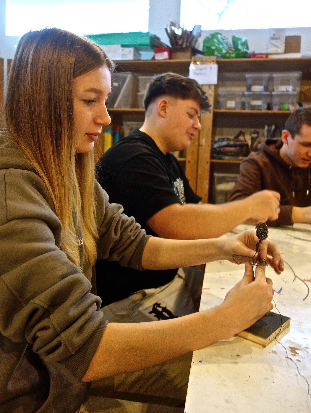 Am 18. und 19. Januar fuhren alle Kunst-Schüler und –Schülerinnen des 12. Jahrgangs mit Herrn Aengenheister, Frau Berking und Frau Hermsen nach Duisburg ins Lehmbruck-Museum. Die beeindruckende Sonderausstellung mit Werken des britischen Bildhauers und Plastikers Anthony Gormley war für alle ein Erlebnis. Als Vorbereitung auf das neue Abiturthema „Rebecca Horn“ konnte man in dieser Ausstellung die Wechselwirkungen von menschlichem Körper und umgebenden Raum erleben und sich über die eigenen Erfahrungen austauschen. Nach der Führung durch die Ausstellung hatte jeder die Möglichkeit in einem Kunst-Workshop eine expressive Figur aus Draht zu entwickeln oder zu zweit oder dritt eine zweidimensionale lebensgroße Figurendarstellung mit geometrischen Formen auszulegen.