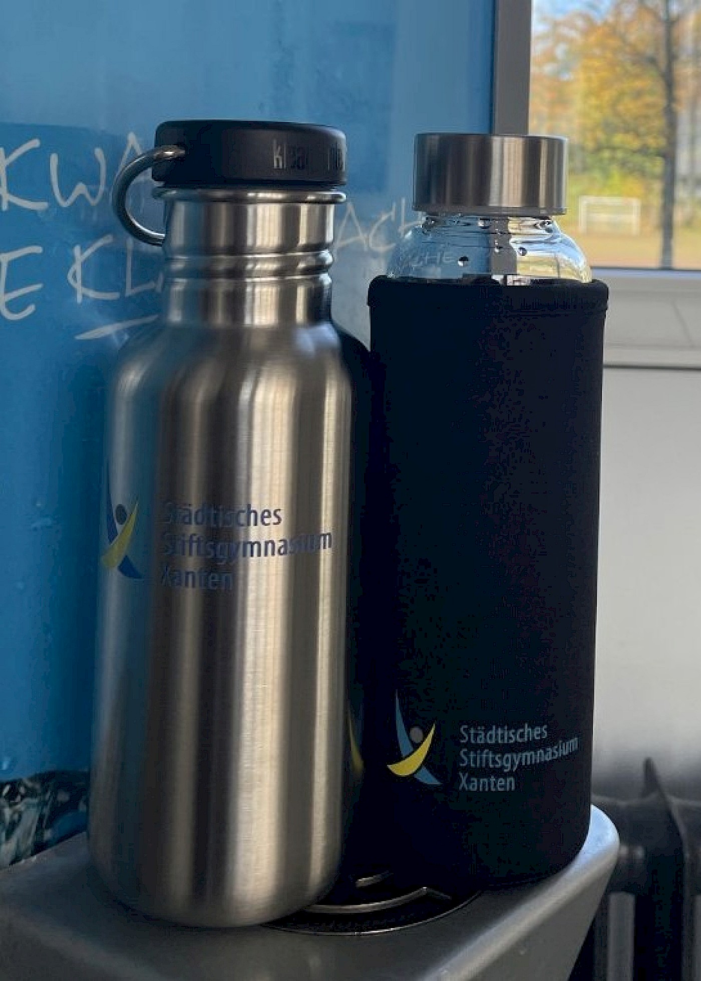 Die SV hat schon vor einiger Zeit den Wünsch ihrer Mitschüler:innen aufgenommen, Trinkflaschen mit unserem Schullogo ins Angebot aufzunehmen. Nach einem gemeinsamen Entscheidungsprozess unter Beteiligung von Schüler:innen, Eltern und Lehrer:innen und ein wenig Wartezeit bis zur Fertigstellung ist es nun endlich soweit. Die etwas kleinere Glasflasche der Firma spottle kann für 10 €, die Edestahl-Variante der Firma kleenkanteen für 15€ erworben werden. Die Preise sind so unschlagbar, weil die SV sich dazu entschieden hat, einen Zuschuss für die Anschaffung der Flaschen beizutragen. Jetzt steht dem Zugang zu frischem, sprudeligem Wasser aus unserem Wasserspender nichts mehr im Wege. Die drei Kanditaten geben ein gutes Team ab, nicht wahr?