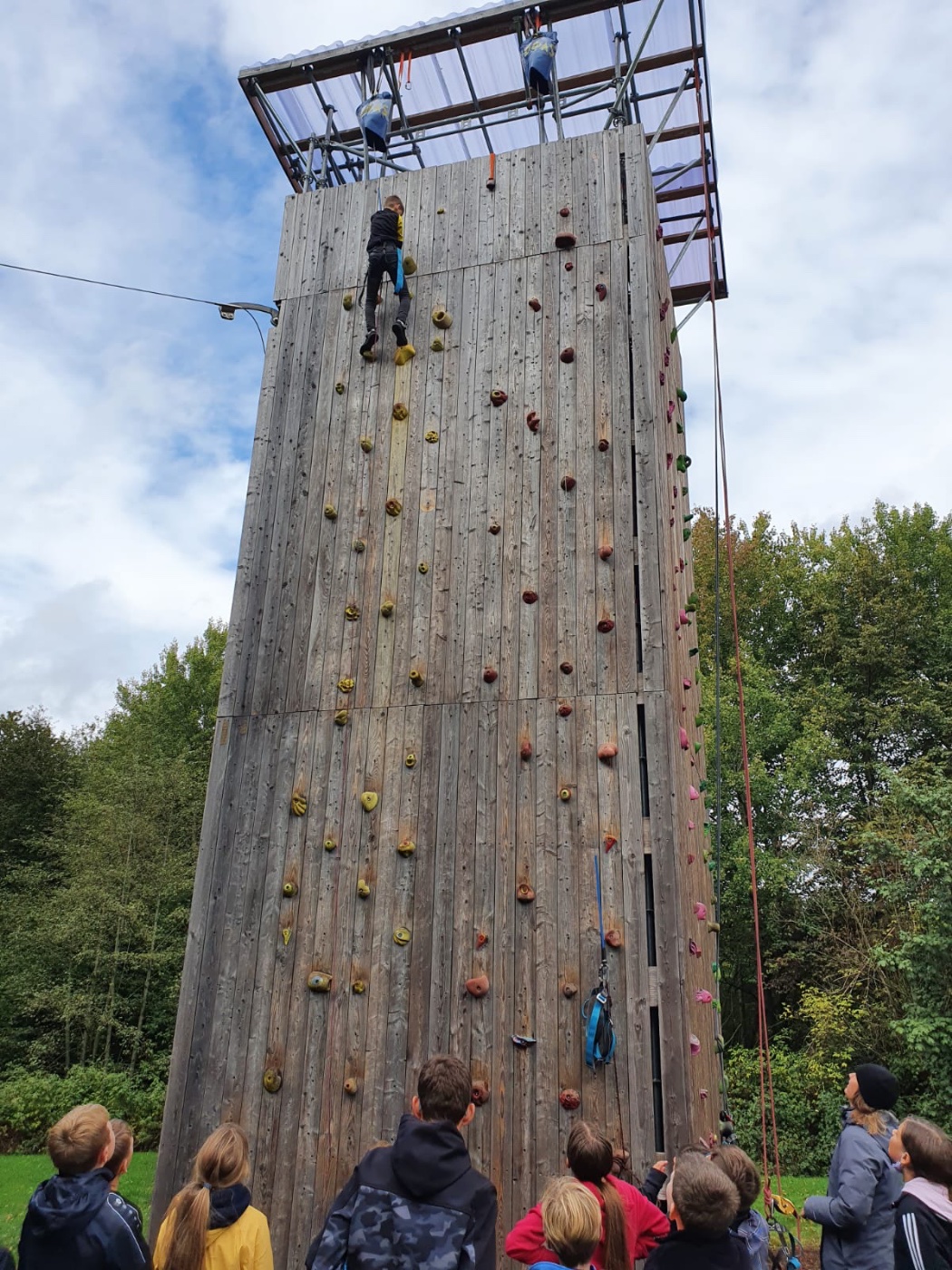 Gemeinsam mit ihren Klassenlehrerinnen starteten am Montag 107 Sechstklässler:innen ins bergische Land nach Radevormwald. Nachdem Koffer und Taschen in der Jugendbildungsstätte des Ortes verstaut waren, ging es für die jungen Schülerinnen und Schüler auf Erkundungstour. Dabei hieß es zunächst – trotz Regenwetters – am kniffligen Kletterturm einen guten Halt zu beweisen. Hierbei lernten die Schülerinnen und Schüler, sich gegenseitig zu sichern und die eigene Höhenangst zu überwinden.