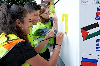 Donnerstag ging es gemeinsam nach Dortmund. Das Street-Art Bingo, eine Art Stadtparcours, bei dem möglichst viele bestimmte Graffitis in einem bestimmten Gebiet innerhalb von 90 Minuten gefunden werden mussten, brachte die Gruppe näher zusammen. Beim Biparcour durch die Stadt Xanten mussten dann am folgenden Tag verschiedene Gruppen Aufgaben lösen und möglichst viele virtuelle Punkte sammeln, während die Stadtgeschichte aufgearbeitet wurde. Innerhalb der Rallye bemalten die Schüler einen der Stromkästen aus dem Projekt „Xanten FAIRschönern“ neu an. Zielpunkt der Stadtrallye war das Rathaus, bei dem Thomas Görtz auch von seinem Besuch in Palästina berichtete. Der Abend endete für manch einen feierlich auf dem Abschlussball der Abiturienten des SSGX. Andere wiederum statteten der Mittsommernacht einen Besuch ab, nach einer durch die Schüler selbst organisierten Tretbootfahrt.