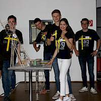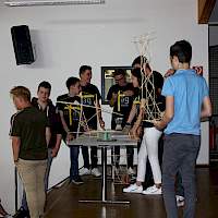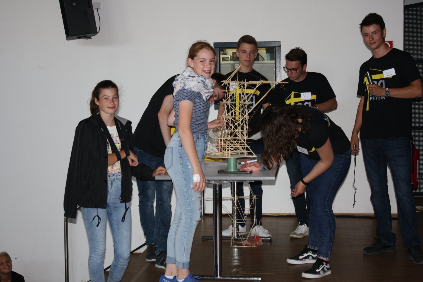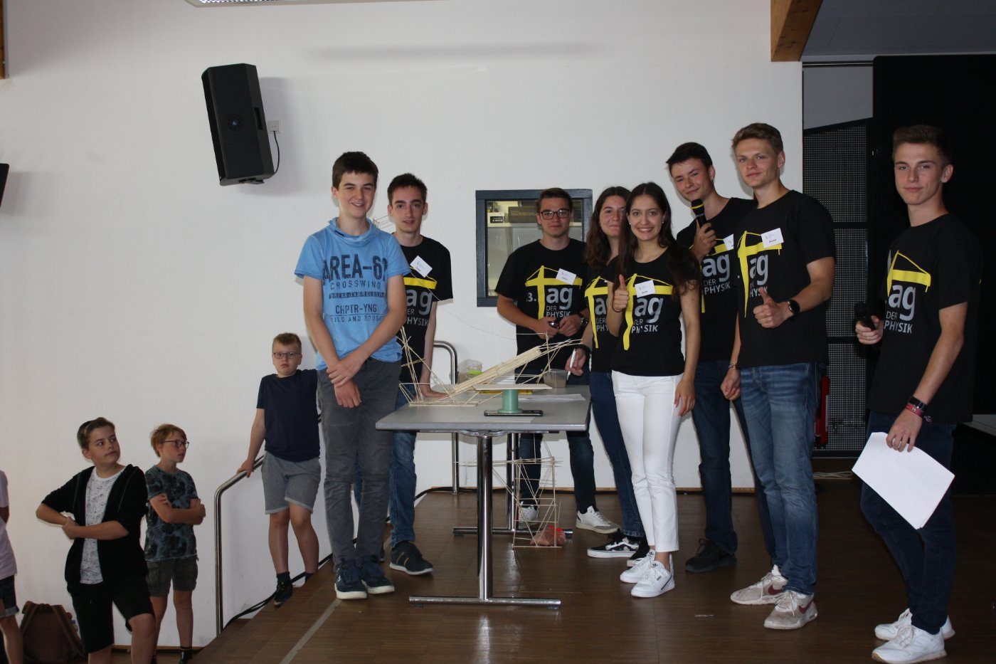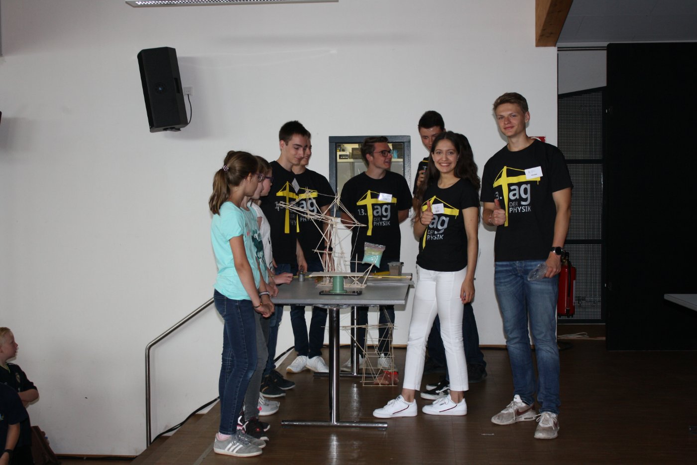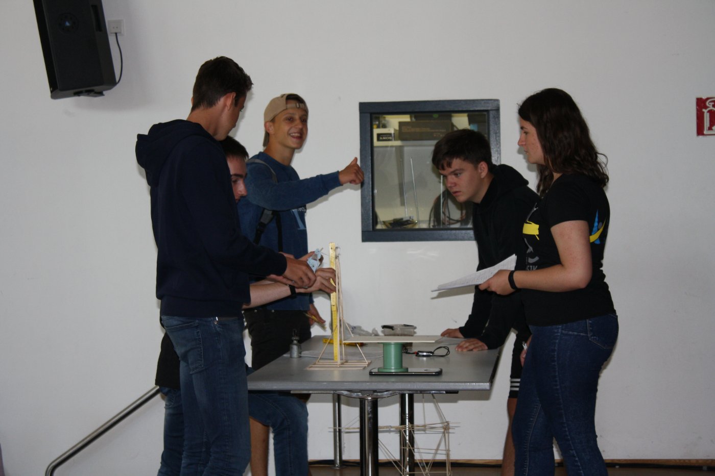 Der Wettbewerb war ein voller Erfolg. 114 Schülerinnen und Schüler in über 50 Teams stellten sich der Herausforderung einen Lastkran aus Schaschlikspießen, Kleber und Faden zu bauen, der eine Mindesthöhe von 40 cm haben musste und an dessen Ausleger in einem Abstand von 25 cm ein Gewicht von 500 g angehängt wurde. Der Kran durfte ein Gegengewicht z. B. in Form eines Sandsackes besitzen und musste der Last 30 Sekunden standhalten. Ziel war es, den leichtesten Kran mit dem geringsten Gegengewicht zu bauen. Die Schülerinnen und Schüler bewiesen viel Ausdauer und Kreativität, sowohl beim Entwurf der Kräne, als auch bei der künstlerischen Gestaltung.