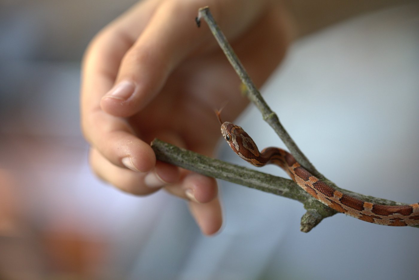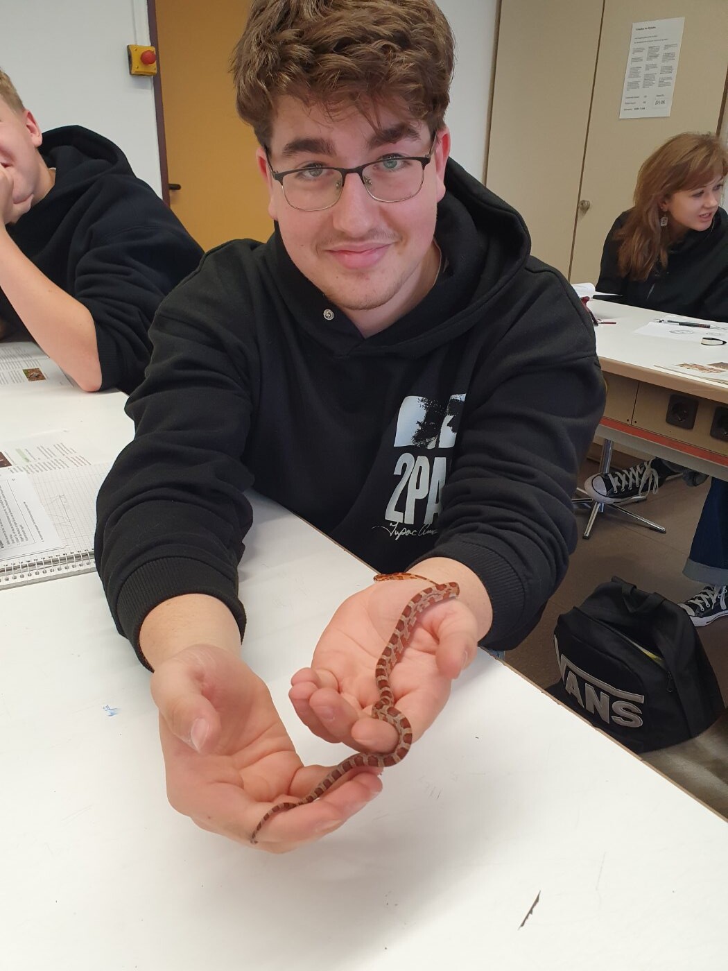 Seit Oktober 2023 pflege wir nsogar Reptilien. Flix und Flux, zwei junge Kornnattern, die wir über den Ring der Vivariumschulen vom Wilhelm Dörpfeld Gymnasium in Wuppertal gegen Eier unserer Türkisblauen Stabschrecken (Achrioptera manga) erhalten haben, bereichern das Leben im Vivarium und werden schon ab und zu im Unterricht eingesetzt.