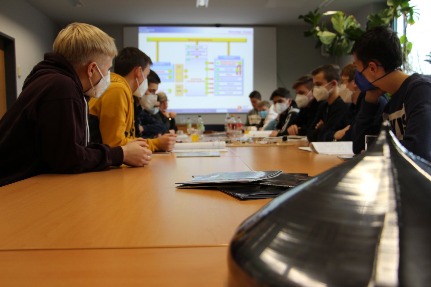 Im Anschluss an die Führung hatten die Schülerinnen und Schüler ihren Auftritt: In kurzen Präsentationen stellten sie einzelne Module einer Alarmanlage vor. Diese Module wurden in einem Elektrotechnik-Workshop unter Leitung von Herrn Dr. Brockerhoff hergestellt, den die Schülerinnen und Schüler zusätzlich zum normalen Unterricht über mehrere Wochen besuchten. Das Ergebnis konnte sich sehen lassen: Der finale Test der Alarmanlage, die durch die Kombination der Module zusammengebaut wurde, war erfolgreich.