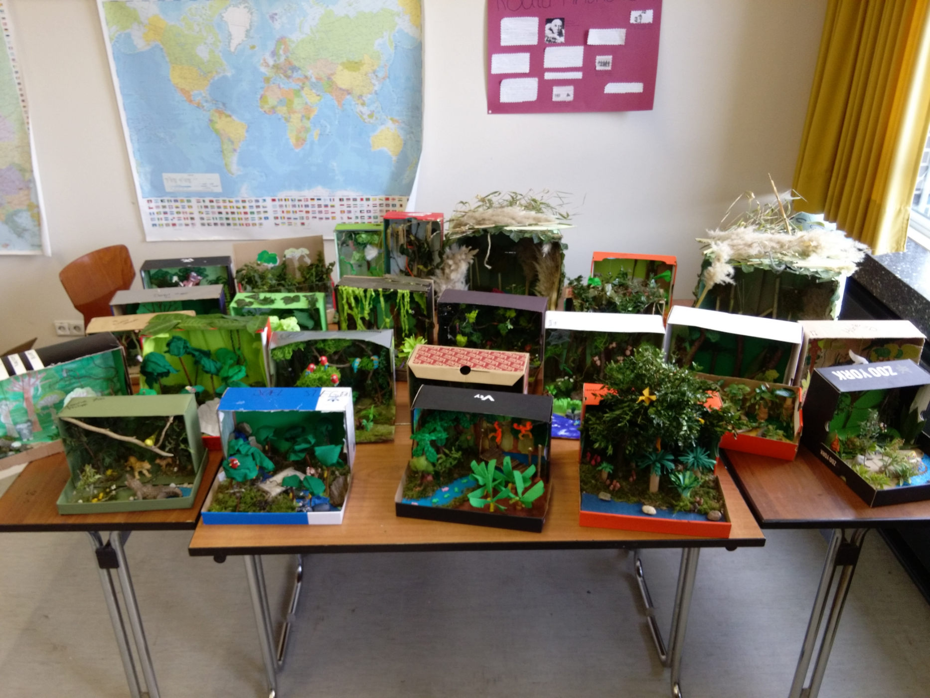 Die Klassen 7a und 7b haben im Schulfach Erdkunde von Herrn Schmitz einen Regenwald im Schuhkarton gestaltet. Auf den Bildern sieht man die grandiosen Ergebnisse. Wichtig war dabei, dass die Bäume möglichst im richtigen Maßstab zu einer Skala standen. Hierbei sollte man den Stockwerkbau erkennen und erläutern können. Neben der Zeit im Unterricht investierten die Schüler/innen viel Mühe und Freizeit, um zu diesen tollen Ergebnissen zu kommen. Details wie Regenwildtiere wurde teilweise aus natürlichen Materialien gestaltet.