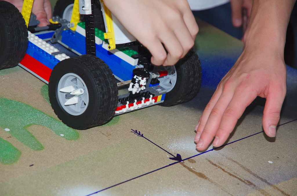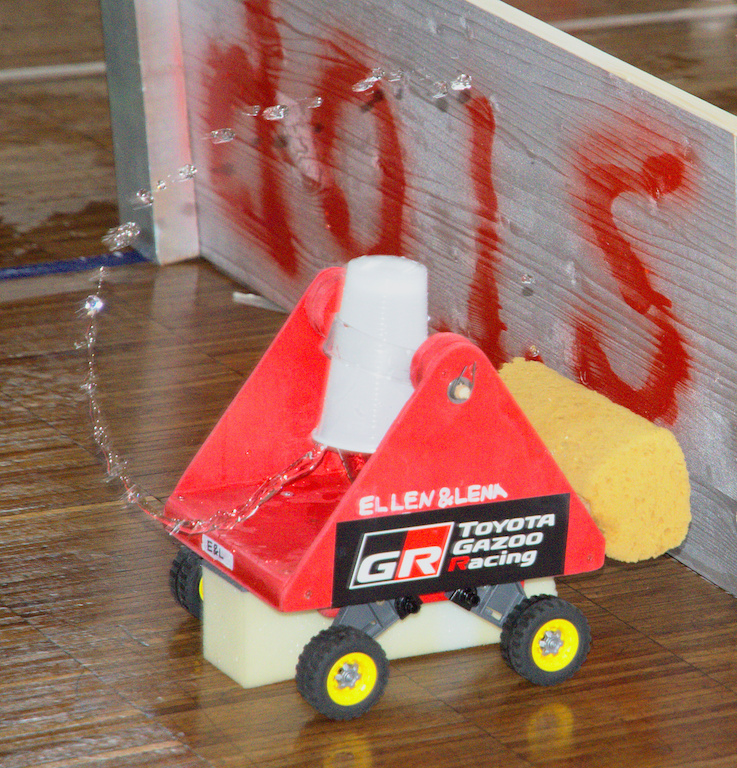 Für den Wettbewerb musste ein Fahrzeug konstruiert werden, welches nach Start von einer Rampe einen mit Wasser gefüllten Becher möglichst unbeschadet „durch“ einen CRASH an einer Wand transportieren sollte.