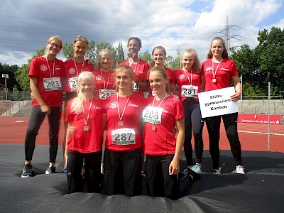 Bei allerbesten äußeren Bedingungen fand in der letzten Schulwoche vor den Sommerferien das Landesfinale der Leichtathleten in Bochum-Wattenscheid im Rahmen des Bundeswettbewerbs „Jugend trainiert für Olympia“ statt. Mit der drittbesten Punktzahl von allen in NRW teilnehmenden Mannschaften hatte sich auch die Mädchenmannschaft des Stiftsgymnasiums für diesen leichtathletischen Endkampf qualifiziert. Hier boten unsere Athletinnen einen tollen Kampf und zeigten durchweg in allen sieben Disziplinen bravouröse Leistungen. Zwar blieb man mit 6693 Punkten leicht unter dem Ergebnis des Vorkampfes, jedoch galt es gleich zwei verletzungs- bzw. krankheitsbedingte Ausfälle zu kompensieren. Insofern war die mannschaftliche Geschlossenheit, mit der die Leichtathletinnen sich wie im Vorjahr Rang zwei sicherten, allemal beeindruckend. Dies sahen auch die beiden Coaches Yves Reinders und Andreas Gorczok so, die wieder einmal das Maximum aus diesem Team herausgeholt hatten und ihren Schützlingen größten Respekt für die erbrachten Leistungen zollten.