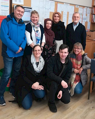 Mohammad und Yunes aus der 9. Klasse, Mariam aus der Q1, sowie Frau Arik, ehrenamtliche Mitarbeiterin der VEZ.NRW aus Duisburg, Herr Atac, Magisterstudent im Studiengang Philosophien der Religionen, Frau und Herr Akgün vom Interreligiösen Arbeitskreis in Xanten und Herr Garske, ehemaliger Religionslehrer und Sprecher des Interreligiösen Arbeitskreises.