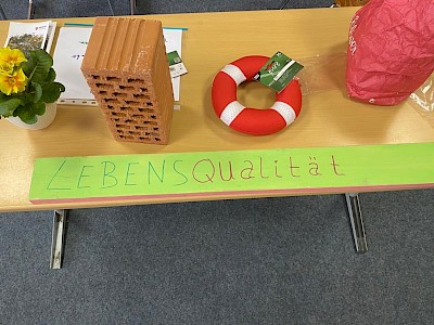 Sie haben den Schülerinnen und Schülern dadurch auch aufgezeigt, welchen Ansatz sie in ihrer Arbeit verfolgen, nämlich sich an den Ressourcen der Familien zu orientieren und diese versuchen zu stärken, damit die sie durch diese schwere Zeit gehen können. Die Sterbebegleiterinnen selbst sehen ihre Arbeit als Unterstützung: einfach da sein – zuhören – die Hand halten, aber auch den Angehörigen ein Zeitfenster zum Kraft tanken zu ermöglichen. Sie möchten, dass das Leben bis zum Ende als würdig, sinnvoll und wertvoll erfahren wird. Das kann durch eine gute Zusammenarbeit von Angehörigen, palliativer Versorgung durch medizinisches Fachpersonal und die Hospizhilfe gewährleistet werden. Es gibt mittlerweile auch einige jüngere Trauerbegleiter*innen, die besonders den Kindern in den Familien eine Stütze sind, da sie Gespräche oder auch Aktivitäten und Abwechslung von dem durch Krankheit geprägten Alltag, anbieten. In einer kleinen Kreativrunde gab es für die angehenden Abiturient*innen die Möglichkeit auf einem kleinen Ring vier Streifen einzuzeichnen, der einen Rettungsring symbolisierend daran erinnern soll, welche Ressourcen die Jugendlichen haben, die sie durch schwere Zeiten tragen, damit sie die eigene Lebenssituation reflektieren konnten.