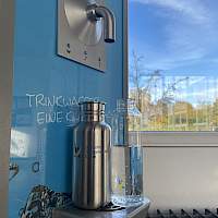 Die SV hat schon vor einiger Zeit den Wünsch ihrer Mitschüler:innen aufgenommen, Trinkflaschen mit unserem Schullogo ins Angebot aufzunehmen. Nach einem gemeinsamen Entscheidungsprozess unter Beteiligung von Schüler:innen, Eltern und Lehrer:innen und ein wenig Wartezeit bis zur Fertigstellung ist es nun endlich soweit. Die etwas kleinere Glasflasche der Firma spottle kann für 10 €, die Edestahl-Variante der Firma kleenkanteen für 15€ erworben werden. Die Preise sind so unschlagbar, weil die SV sich dazu entschieden hat, einen Zuschuss für die Anschaffung der Flaschen beizutragen. Jetzt steht dem Zugang zu frischem, sprudeligem Wasser aus unserem Wasserspender nichts mehr im Wege. Die drei Kanditaten geben ein gutes Team ab, nicht wahr?